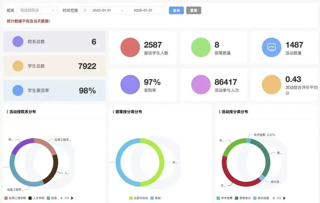 我校学生总数为7922人,学生激活率达到98%,2025-2026年共举办1487个活动。活动参与人次为86417,总体活动签到率达到97%。
