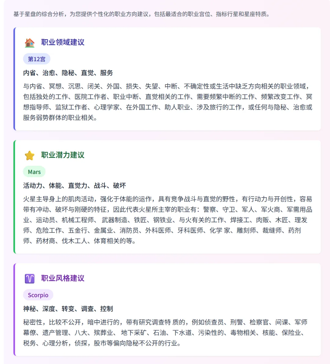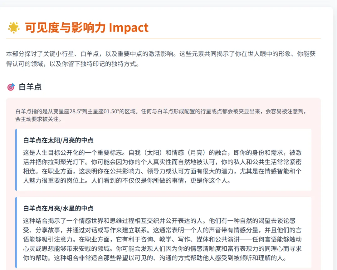 精准职业领域建议:根据你的星盘配置(如第7宫的合作特质),为你推荐最能发挥你优势的行业与领域,例如法律、咨询、公共关系或创业。