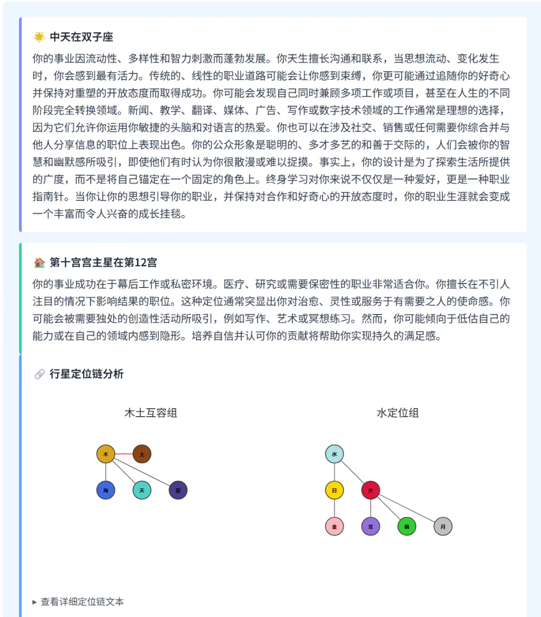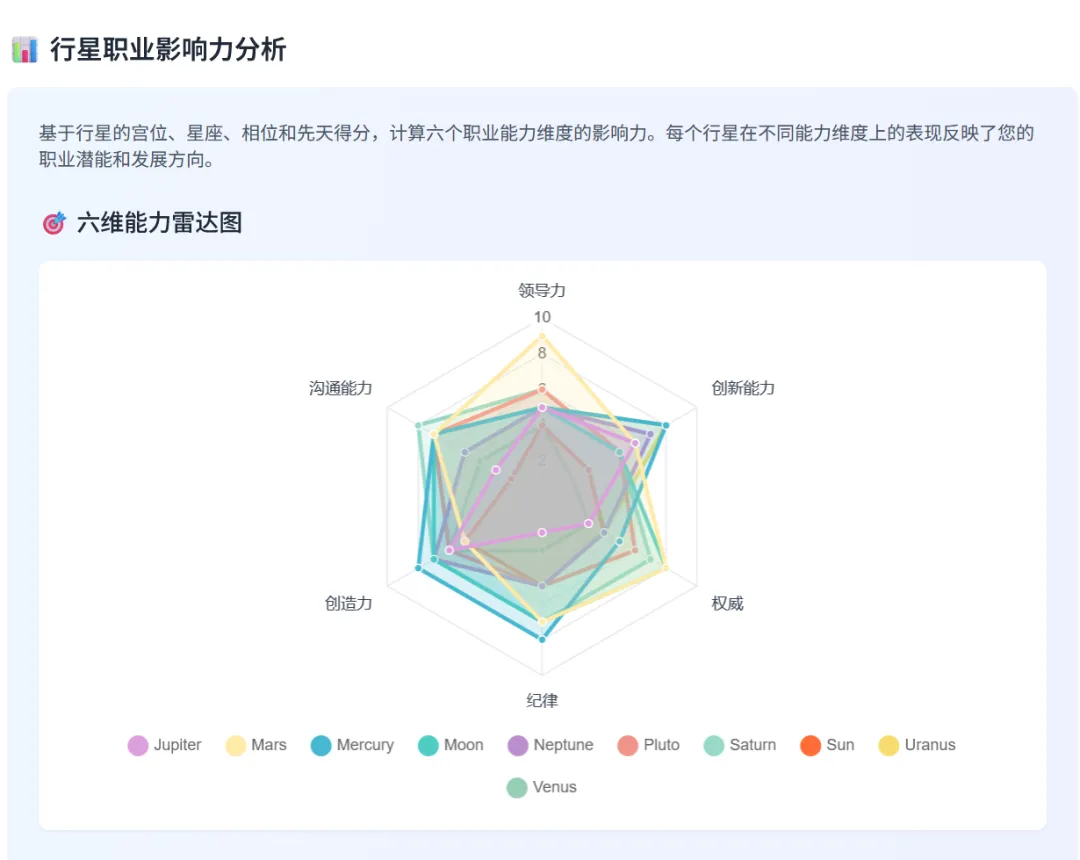 核心行星潜力指引:揭示你的关键行星(如太阳)所代表的职业潜力,为你指明具体的职业角色,如管理者、表演者或技术专家。