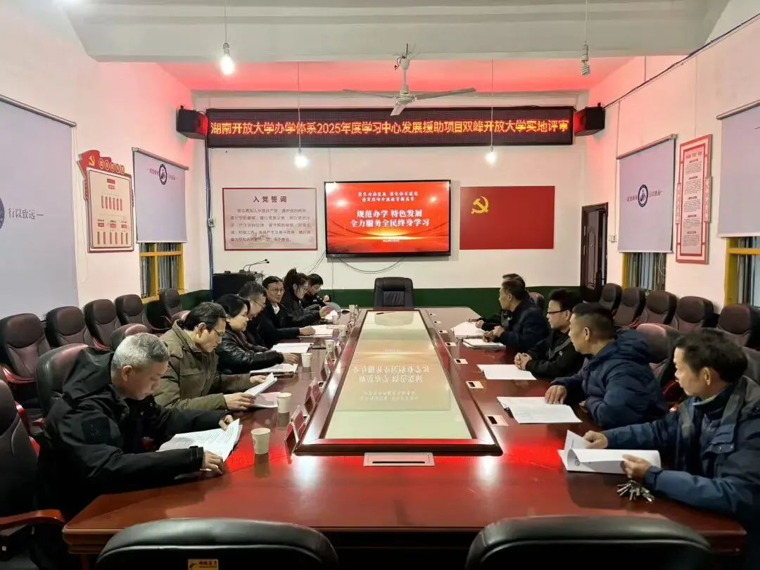1月4日下午,湖南开放大学来我校实地评审“办学体系2025年度学习中心发展援助项目”、考察学校办学情况并召开座谈会。湖南开放大学党委副书记方小勇、招生就业与系统建设处处长郭贤锋、娄底开放大学党委书记欧芳、副校长吴芋、招生就业科科长邱迎春、我校领导班子及相关负责人参加会议。会上,党总支书记、校长贺飞汇报了双峰开放大学当前教育教学的基本情况。评审组认真听取汇报后,结合实地考察情况进行点评,对我校办学过程中展现的责任担当与务实举措给予充分肯定。方小勇代表评审组指出,开放大学学习中心是推进终身教育的重要载体,希望双峰进一步夯实办学基础,优化教学管理流程,强化师资队伍专业化建设,持续提升教育教学质量。随后,双方就学习中心发展规划、援助项目落地细节、办学困难等问题展开深入交流探讨。我校领导表示,将认真梳理评审组提出的意见建议,细化整改举措,借力援助项目推动学校办学水平再上新台阶,更好地服务区域终身教育发展需求。