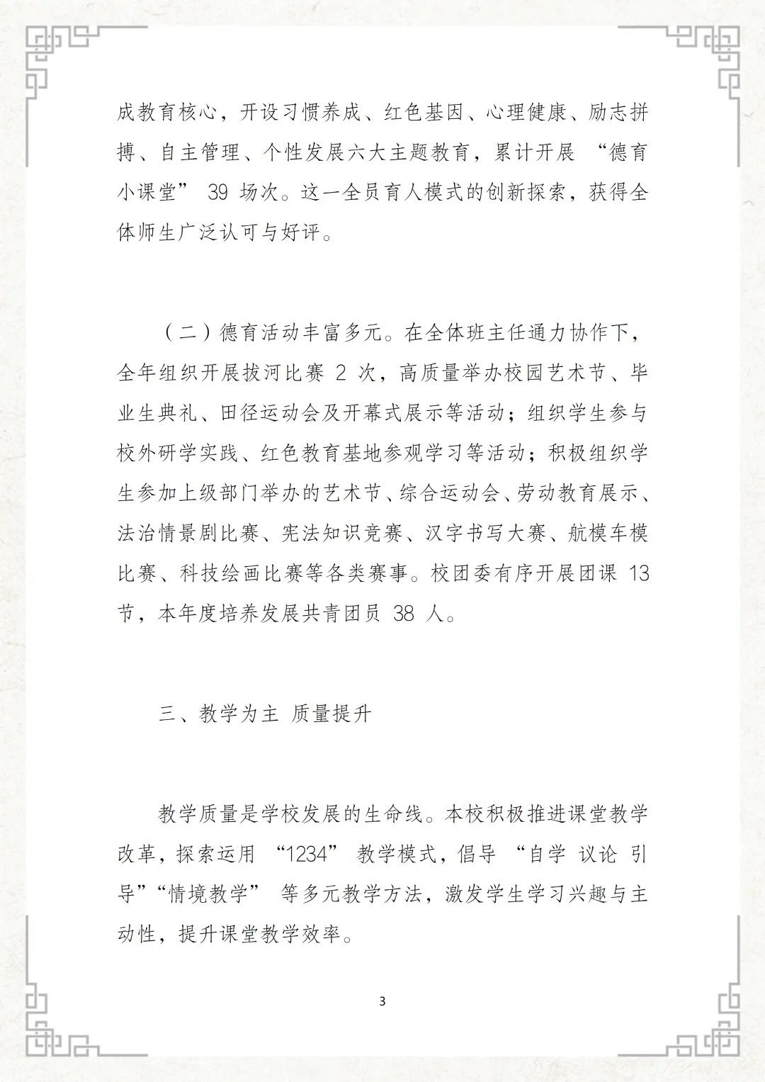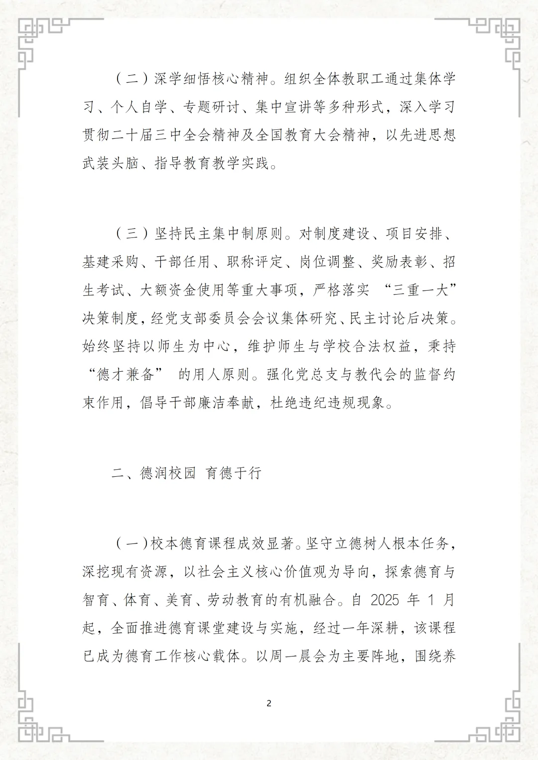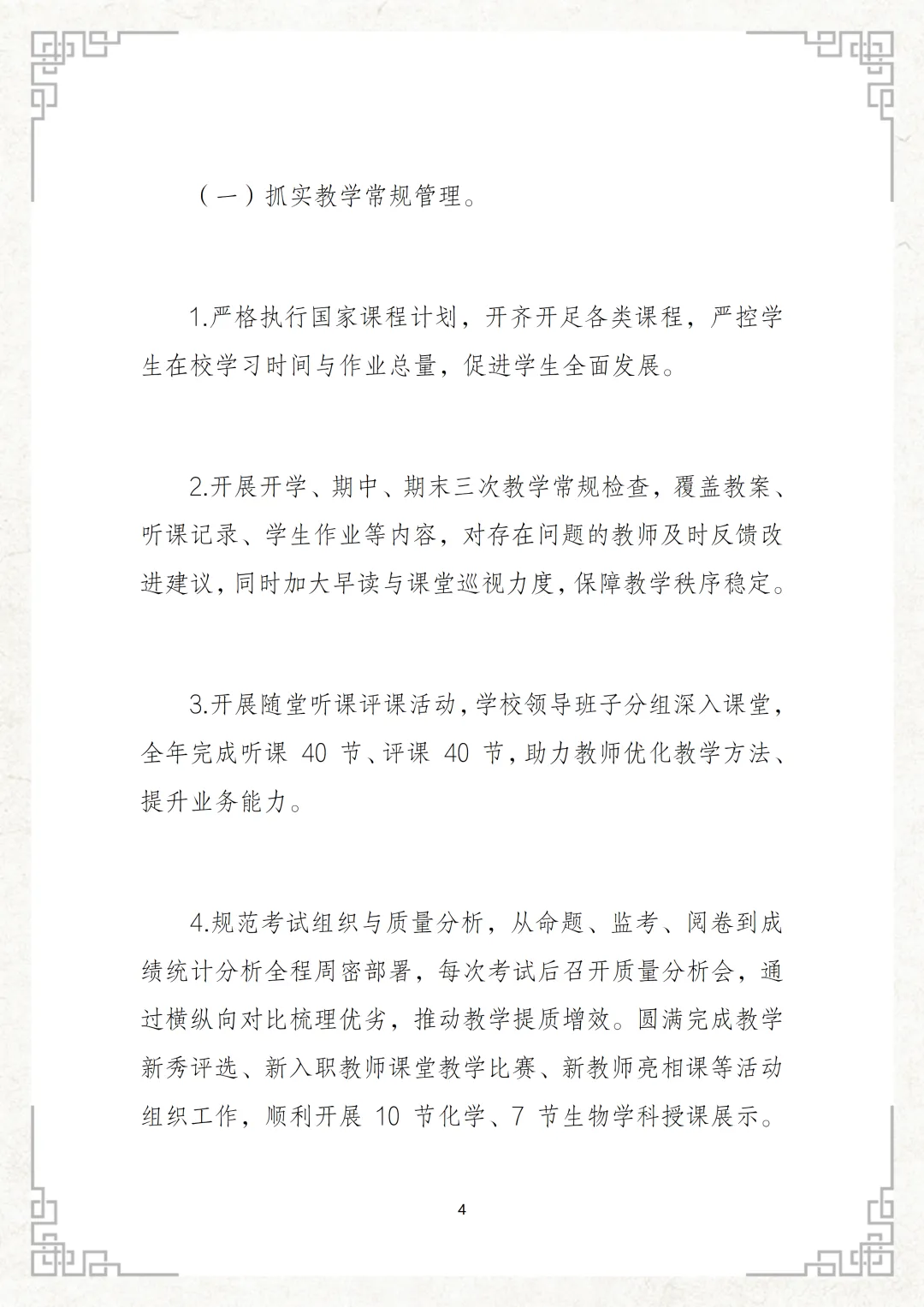 岁月如诗裁锦绣,华年似玉耀辉煌。在上级教育主管部门的正确领导下,在社会各界的关心支持下,本校聚焦教育高质量发展,落实立德树人根本任务,为党育人、为国育才,大力践行教育家精神,办人民满意的教育,在育人之路上稳步前行。一年来,全体教职工坚持以教学为中心、以安全为重点,强化各项管理,圆满完成年度各项工作任务。