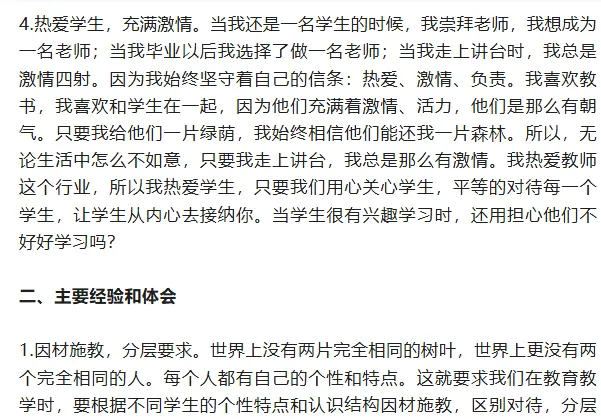 当然,教育教学中,我还有许多不足,我会在以后的工作中不断完善自己,努力提高自己的业务能力水平,争做一个学生热爱,家长放心,社会认可的好老师。
