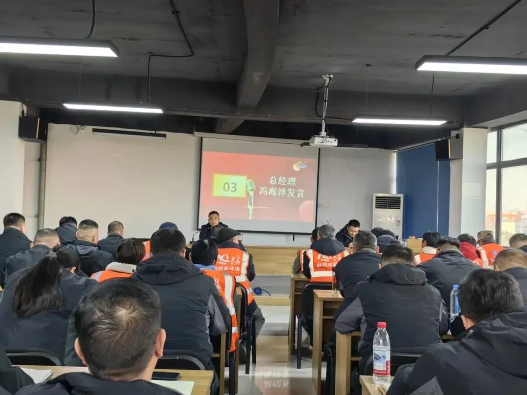 会议第三项议程,临泉自然美环境卫生管理有限公司总经理冯海洋作重要讲话。冯海洋总经理围绕安全管理、品质管控、预算达成、商务协同、团队建设五大核心维度,全面系统地回顾了2025年公司的发展历程与工作成效。他指出,过去一年,在全体员工的共同拼搏下,公司实现人员车辆安全事故双下降的目标,环卫服务品质稳步提升,赢得政府领导和群众的广泛认可;预算管控精准高效、执行落地到位,商务合作关系持续深化,团队凝聚力与战斗力显著增强。这些成绩的取得,离不开每一位员工的不懈耕耘与担当奉献。