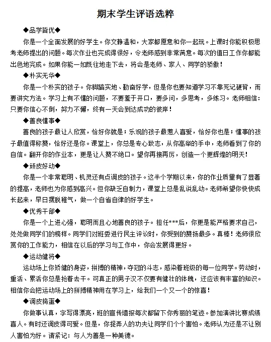 今天平凡老师为大家搜集整理了:期末评语大全!共1000多则!还有工作总结+家长会PPT!班主任老师可以根据本班情况,直接套用,也可以适当修改、改动,可减轻老师们负担。