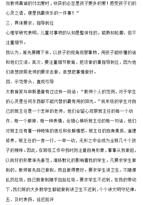 爱,是教师职业道德的核心,一个班主任要做好本职工作,首先要做到爱学生。“感人心者,莫先乎情。”工作中,我努力做到于细微处见真情,真诚的关心孩子,热心的帮助孩子。我深信,爱是一种传递,