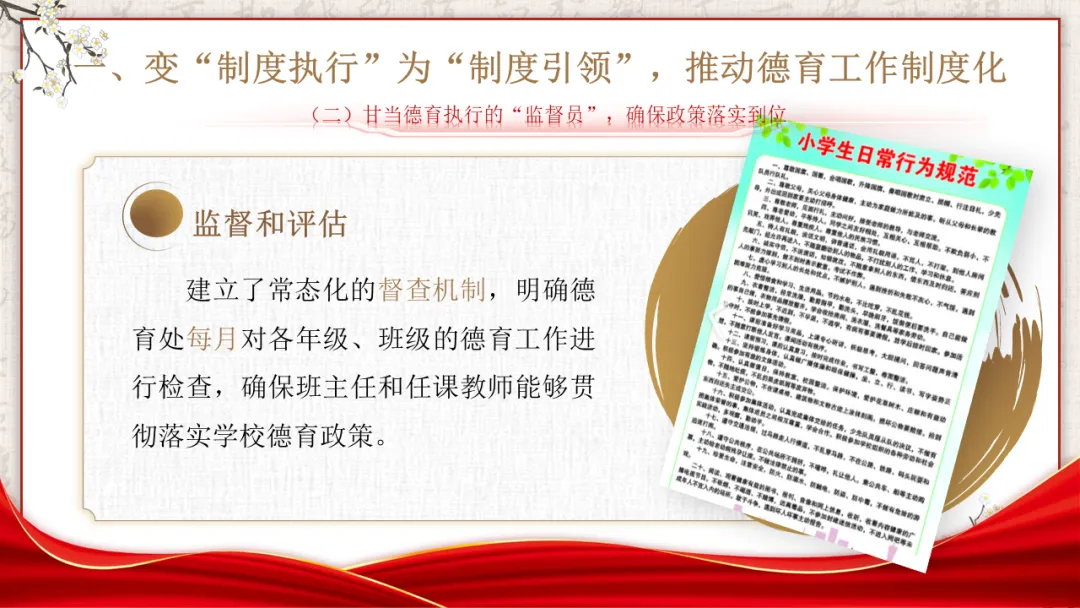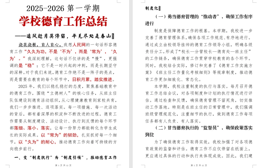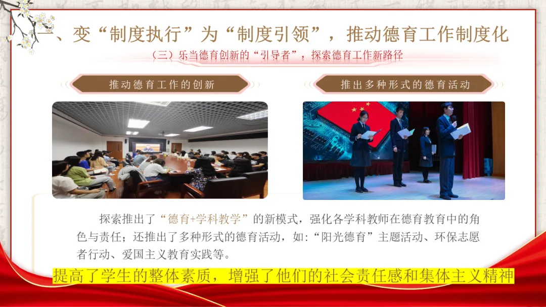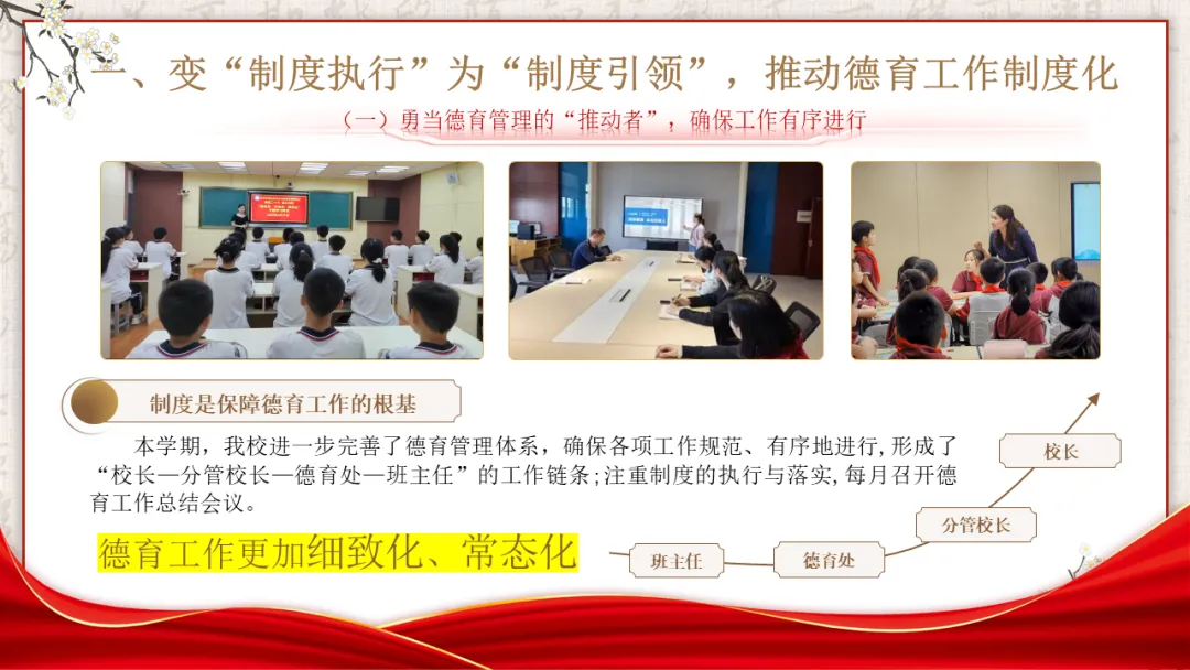 完善德育管理体系,形成校领导牵头、德育处落实、班主任主责的工作链条。修订《德育工作实施方案》等制度,强化执行与反馈,通过月度总结、班级量化考核,确保德育工作规范、常态、落到实处。