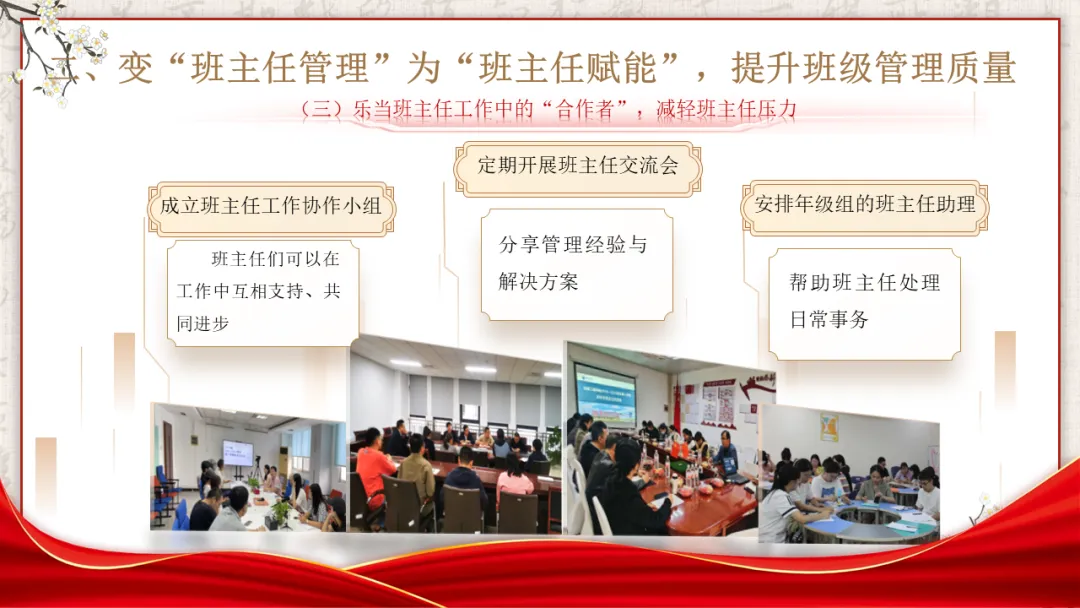 班主任是德育核心力量。学校通过定期培训、心理辅导课程、经验分享会,提升其专业能力与心理洞察力。同时,注重班级文化建设,营造积极向上的班级氛围,并通过协作小组、助理配备等措施,减轻班主任负担,使其更聚焦学生成长。