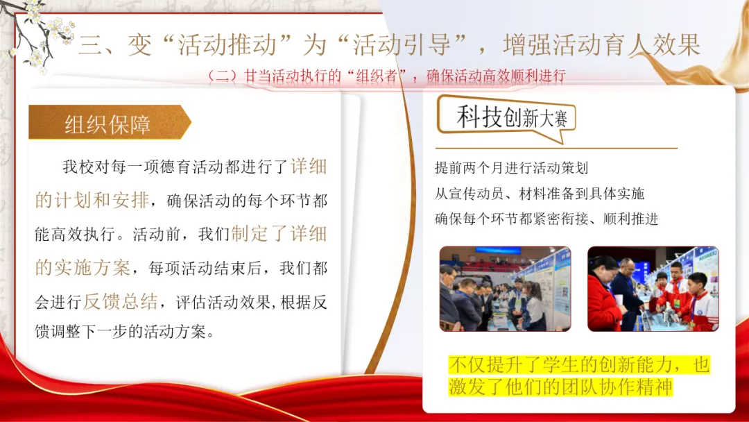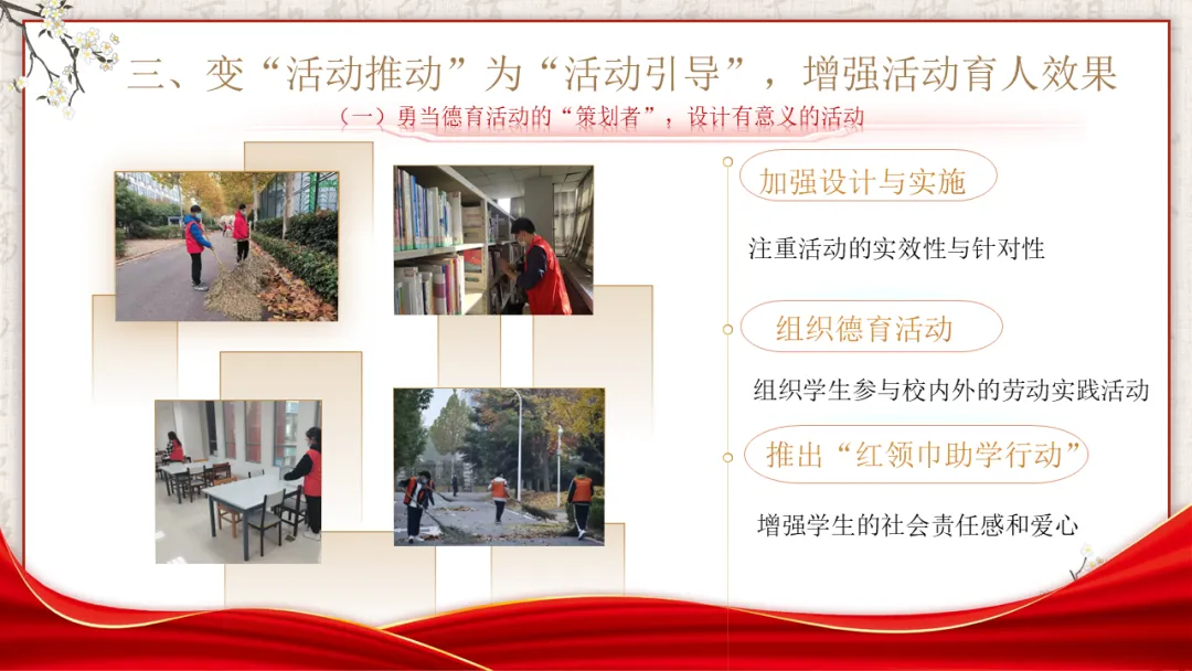 精心设计并组织系列德育活动,如“劳动教育月”、“红领巾助学行动”、“科技创新大赛”等,强调学生参与感与实践性。活动前周密策划,活动中有序组织,活动后引导反思,让学生在体验中培养责任感、创新力与团队精神。
