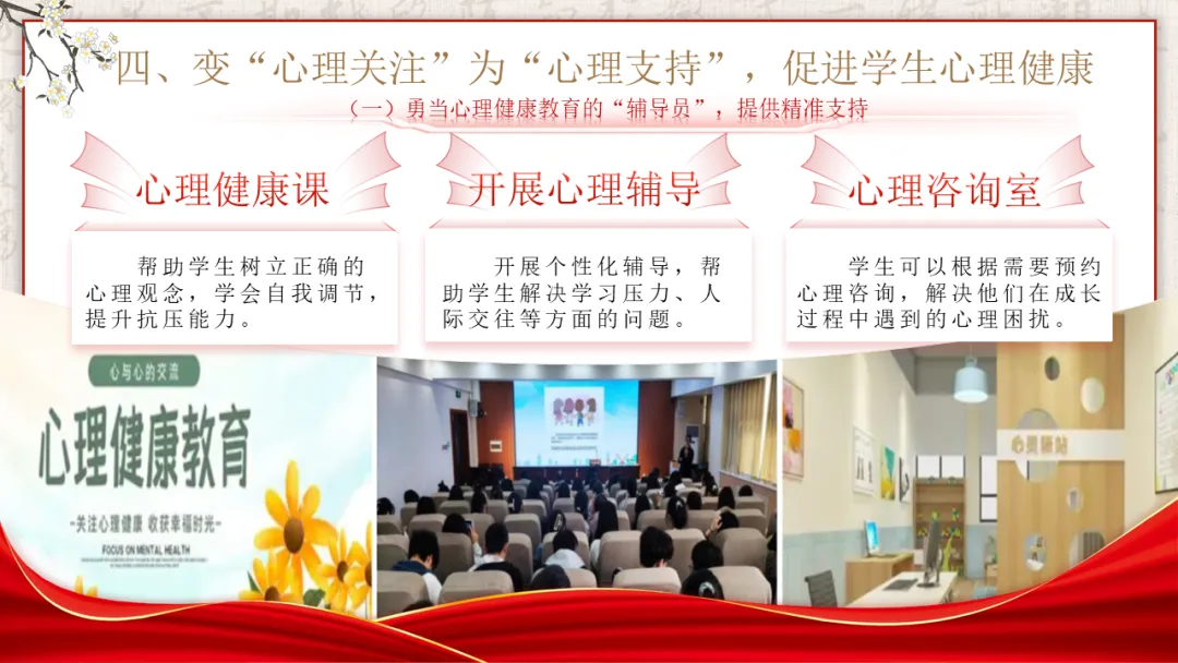 将心理健康教育融入日常,通过心理健康课、专题讲座、个体与团体辅导等多形式,帮助学生树立健康心态,提升情绪管理与抗压能力。建立全员关注机制,班主任、心理教师联动,及时发现并疏导学生心理困惑,守护心灵成长。