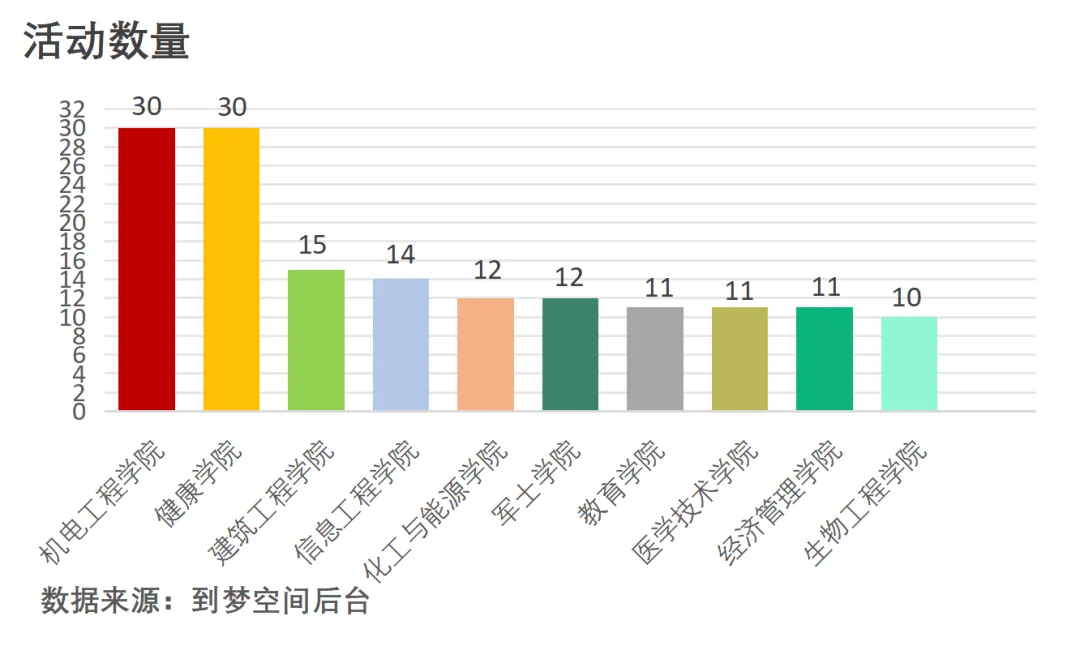 2.累计活动数是二级学院使用到梦空间系统之日起产生的数据,各二级学院使用时间不一,仅供分析和参考。