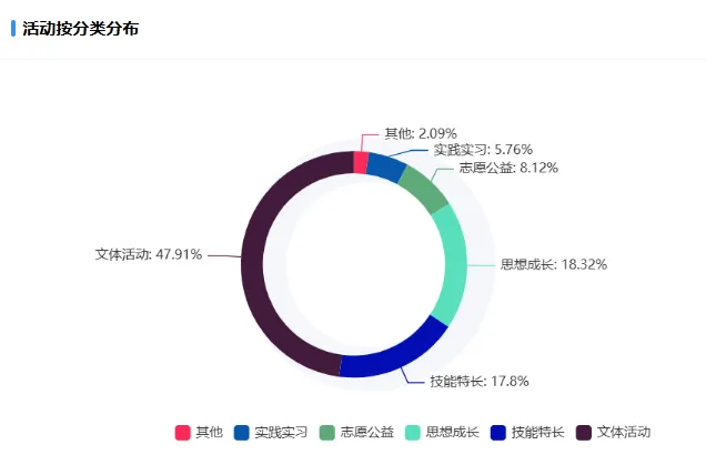 在第二课堂活动供给类型方面,文体活动类活动占47.91%,思想成长类活动占18.32%,技能特长类活动占17.8%,实践实习类活动占5.76%,志愿公益类活动占8.12%,其他类活动占2.09%。