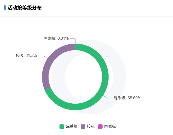 数据显示,截止2025年12月31日,第二课堂活动中,国家级活动占0.01%,校级活动占31.3%,院系级活动占68.69%。