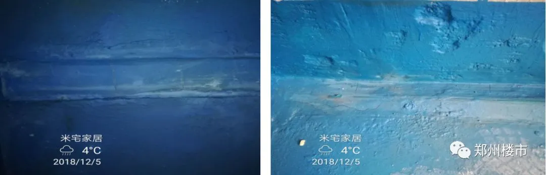现场发现的问题:一遍防水刷完晾干过程中,巡检发现阳台墙根处因拆除保温墙后地面有凹槽涂刷过厚产生裂纹,另卫生间用水泥做的档水槽有微裂纹。↓↓↓