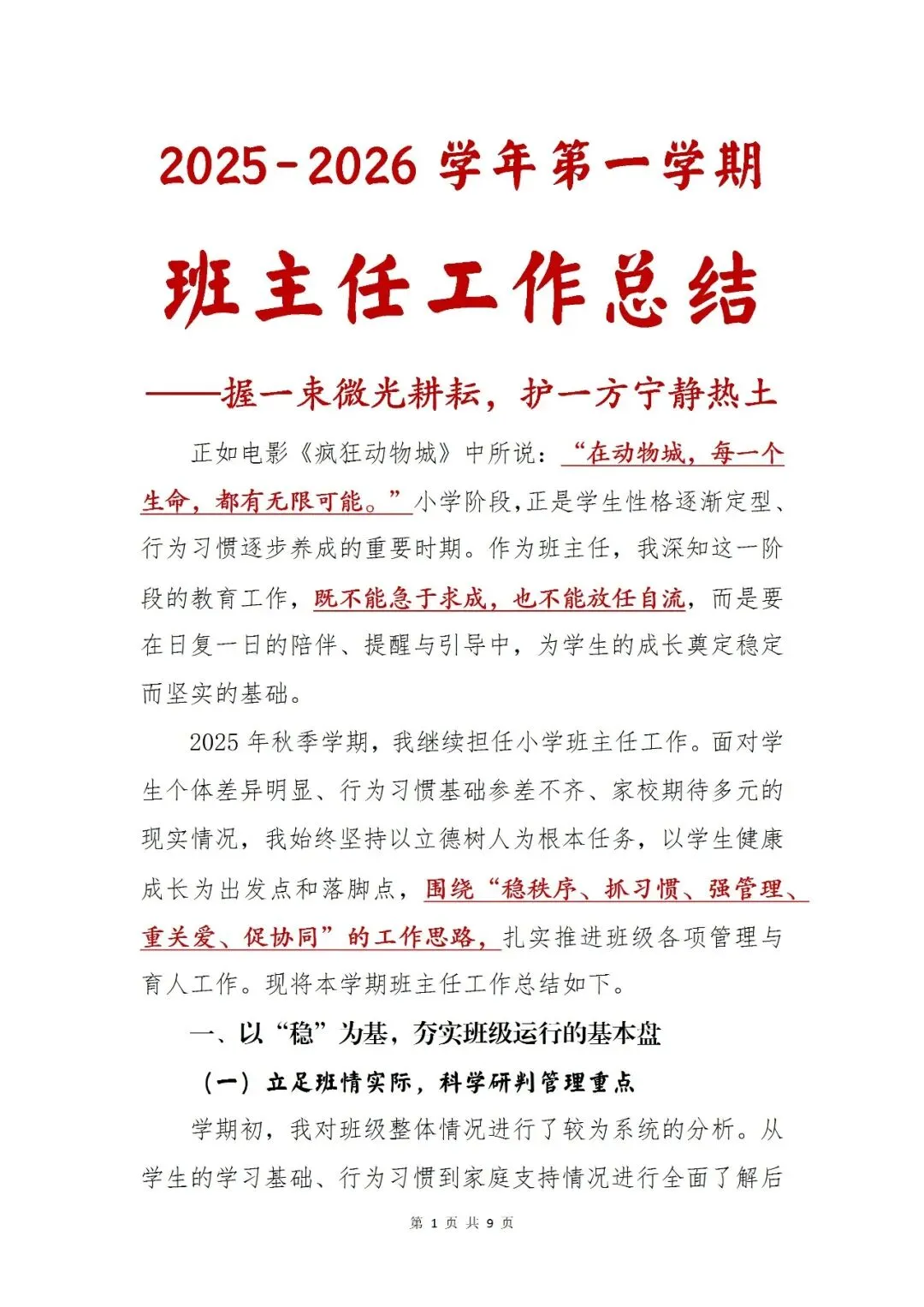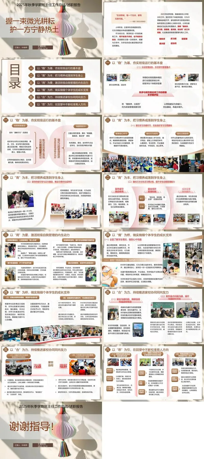 >2025-2026学年第一学期【班主任】工作总结:握一束微光耕耘,护一方宁静热土word版+PPT