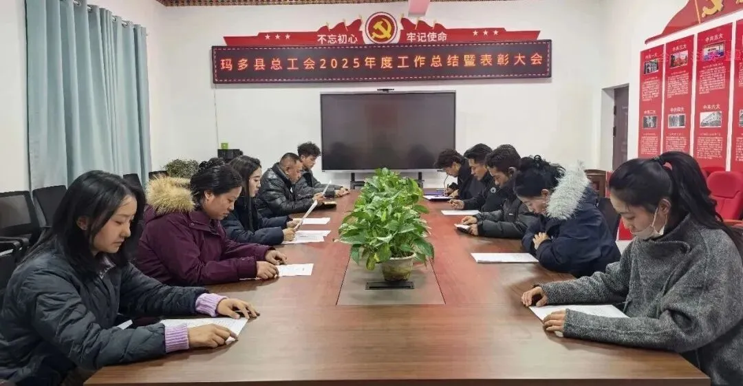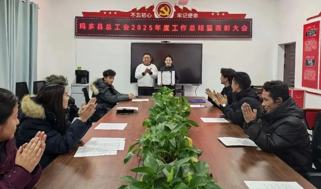 1月10日,玛多县总工会召开2025年度工作总结暨表彰大会。县总工会常务副主席玛沁加出席并主持会议,全体干部职工参加。