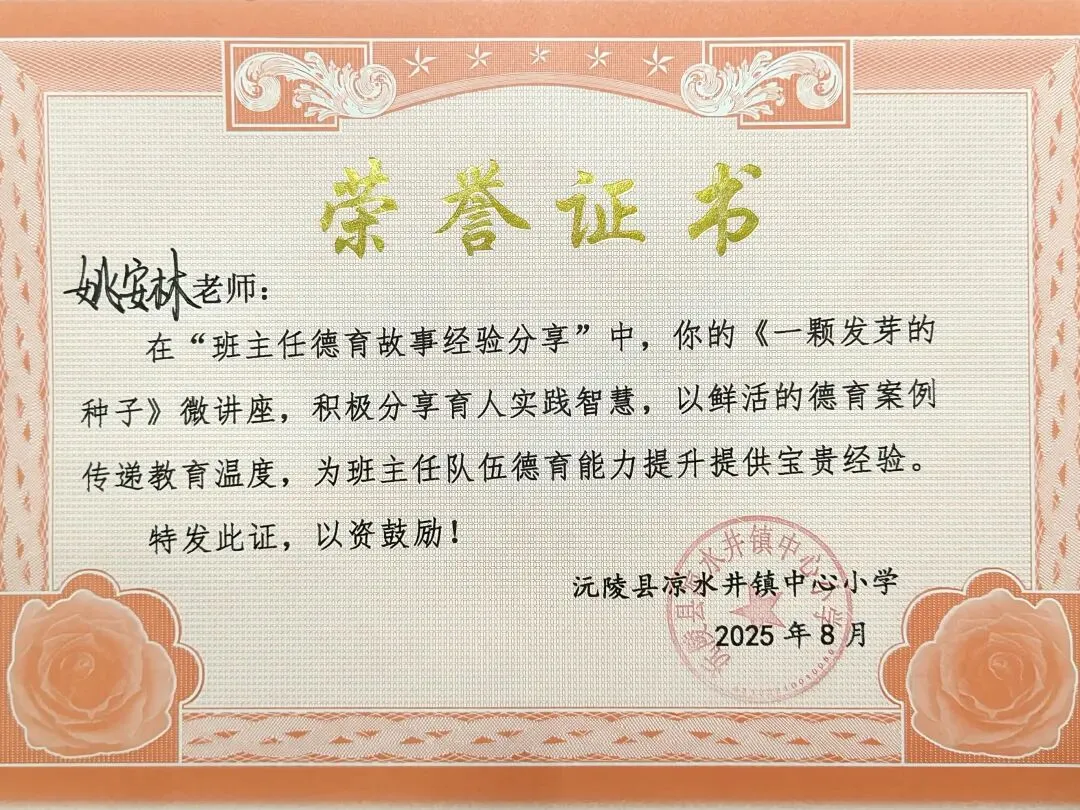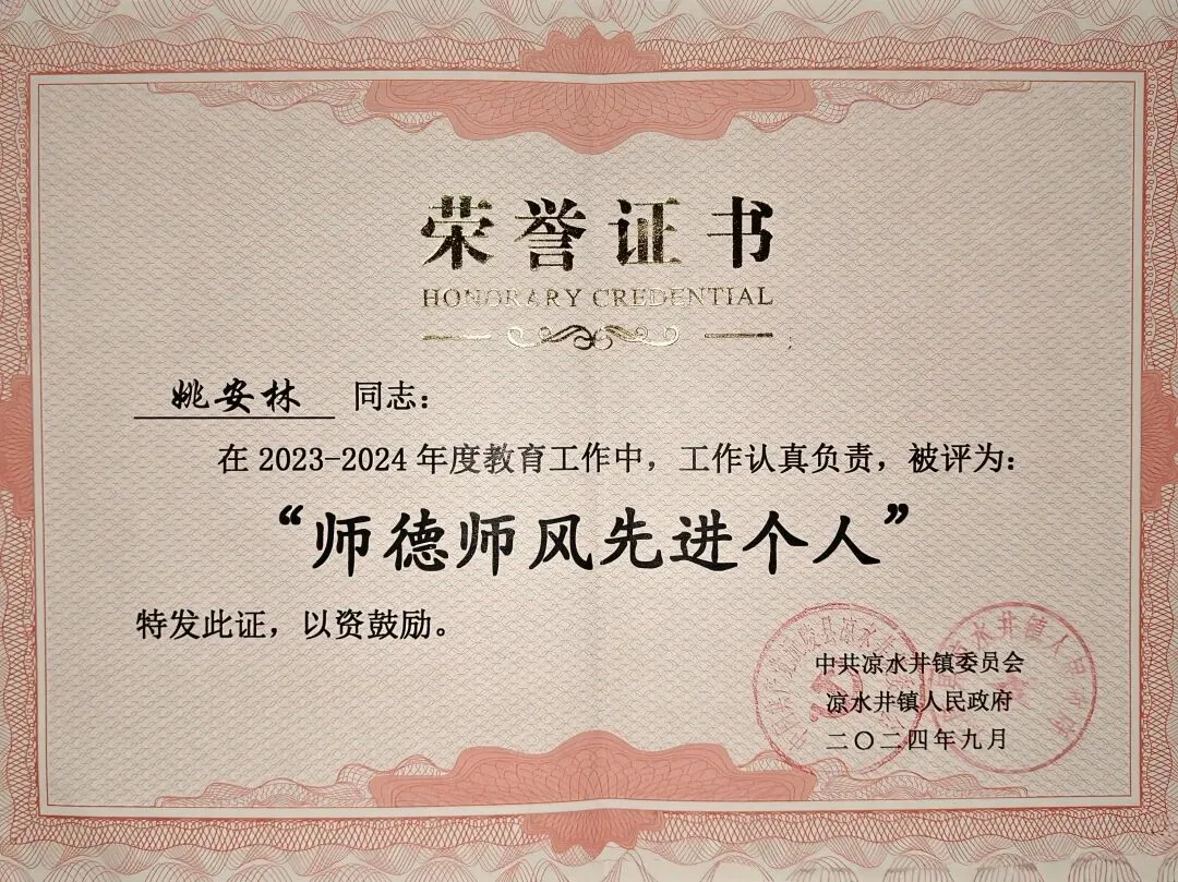 这是对我过去一年师德表现的高度认可,激励着我在今后的工作中继续坚守师德底线,做学生成长路上的引路人。