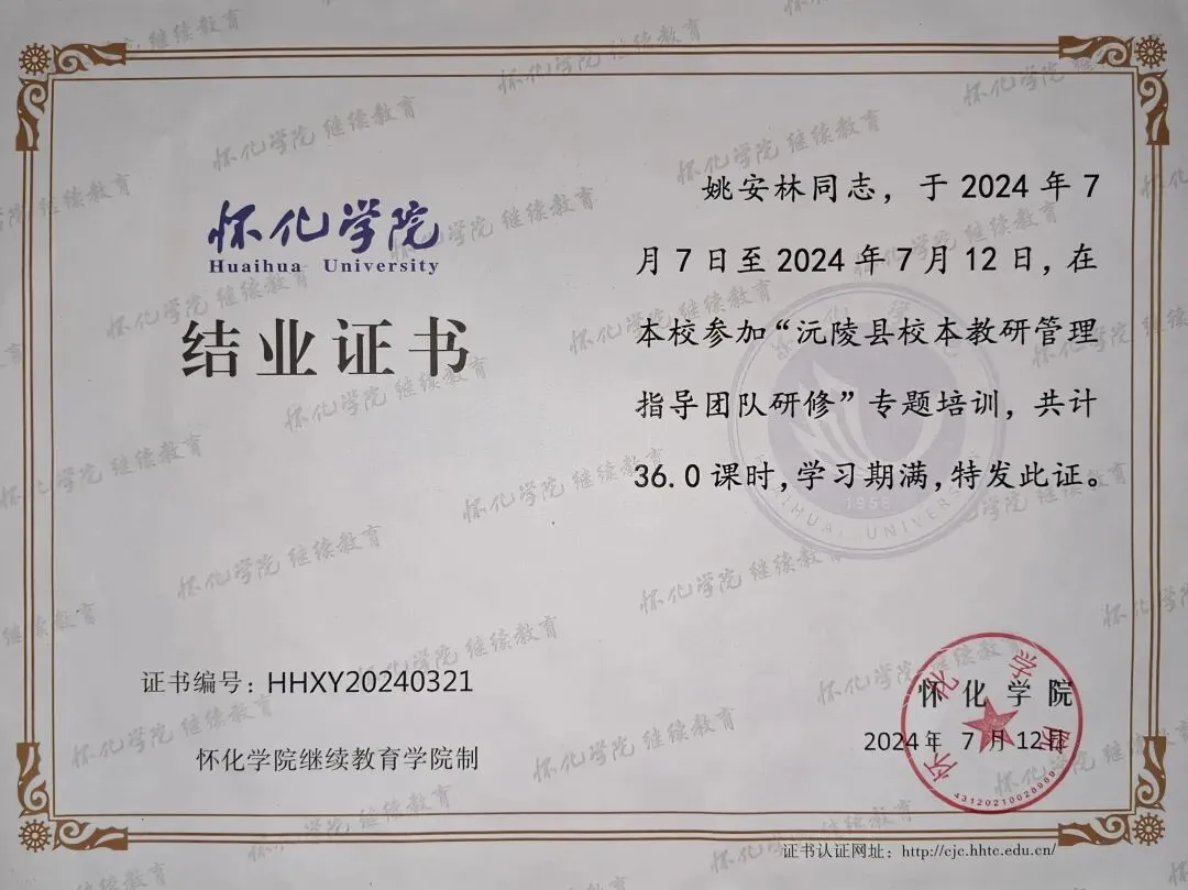 同年,我参加沅陵县校本教研管理指导团队研修专题培训,获得结业证书。