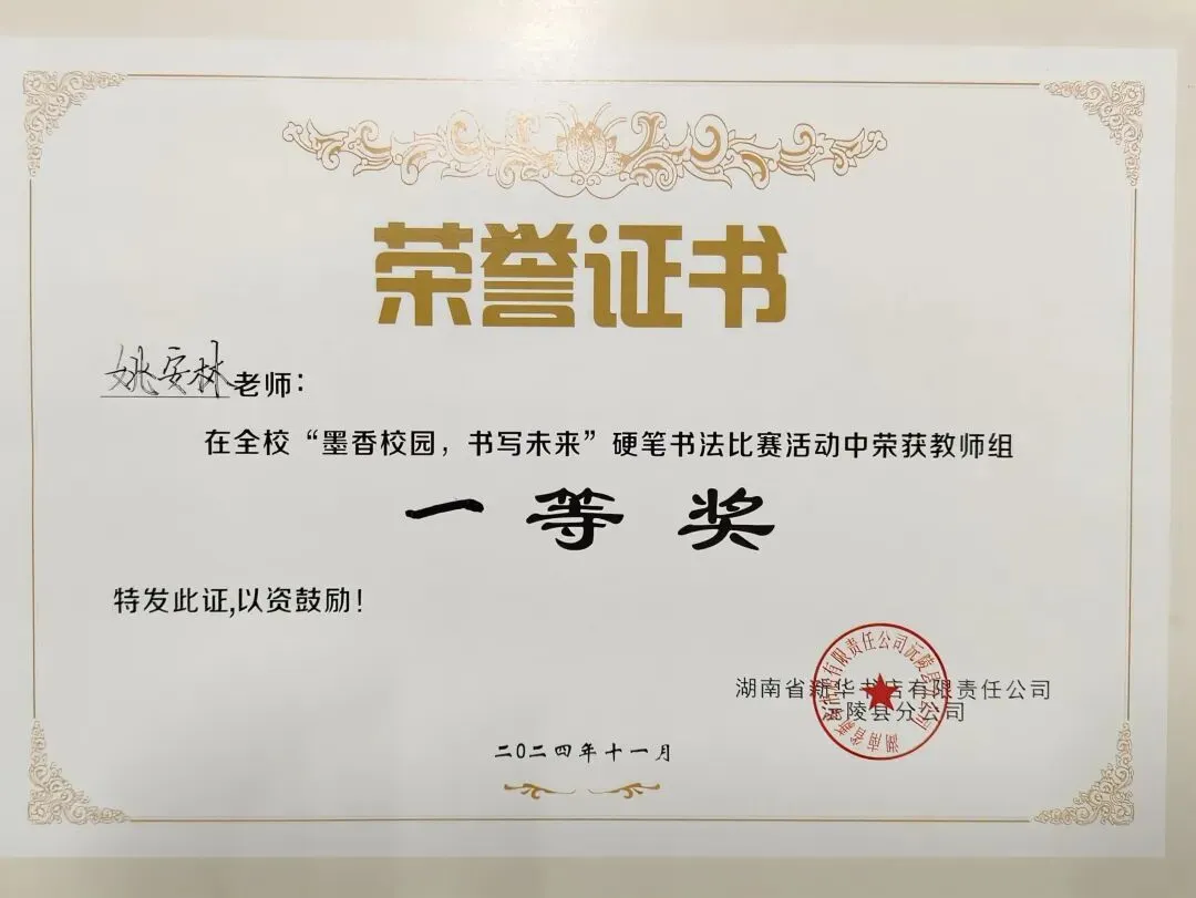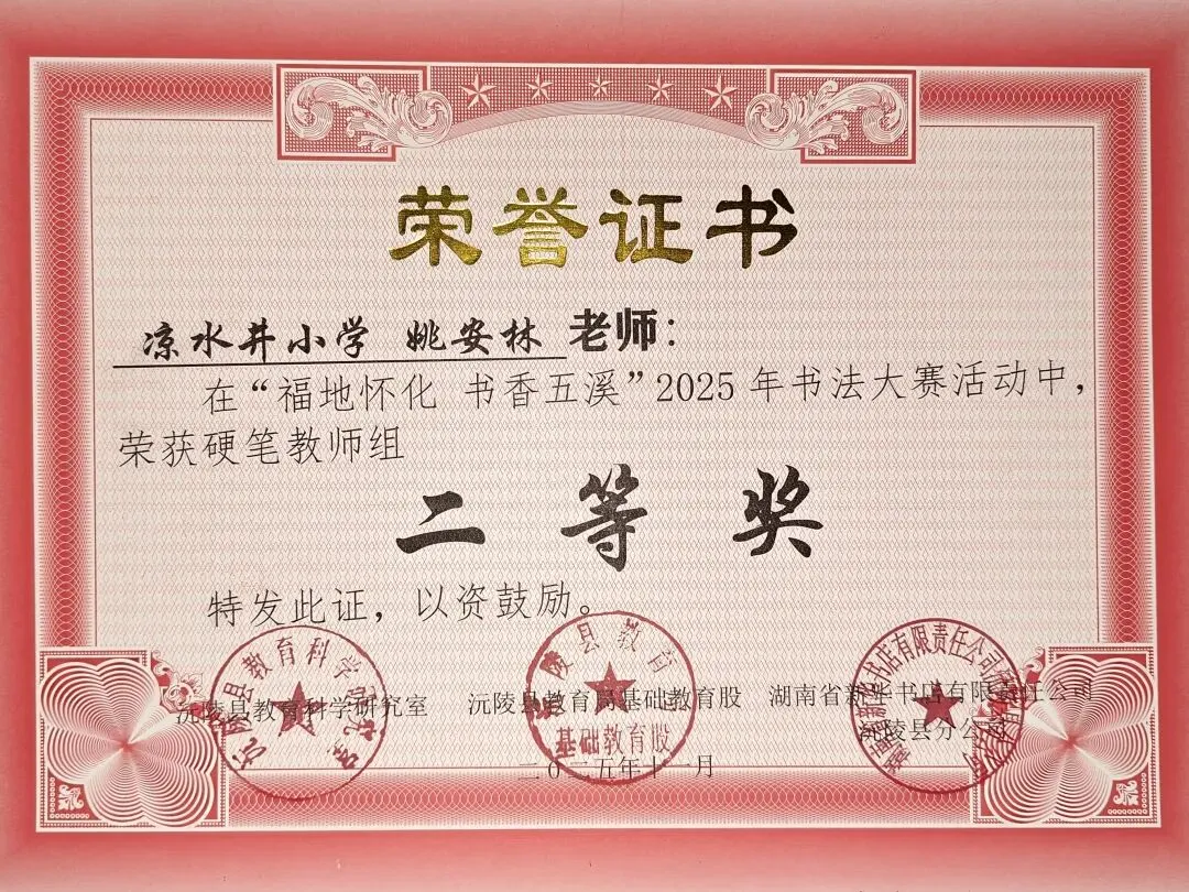 在“福地怀化,书香五溪”2025年书法短视频分享大赛中,我荣获硬笔教师组二等奖。