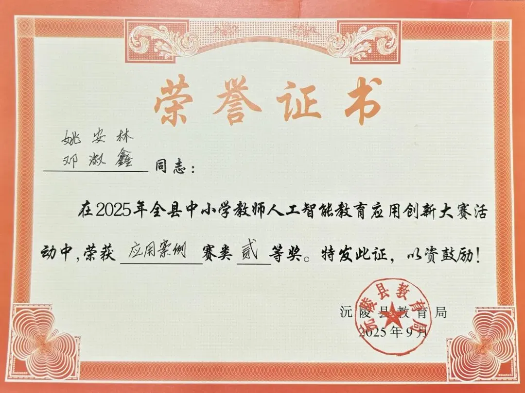在 2025 年全县中小学教师人工智能教育应用创新大赛活动中,我积极探索人工智能与教育教学的融合,荣获应用案例县级二等奖。