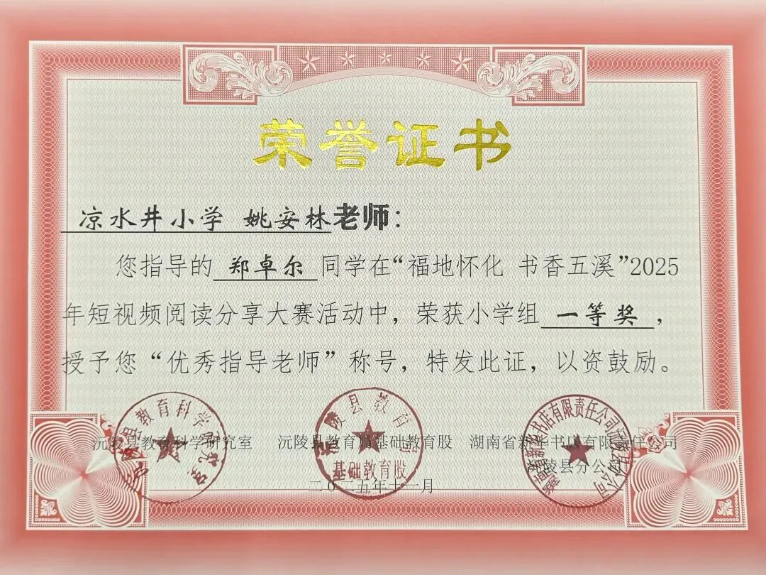 此外,在阅读分享活动中,我也带领学生取得了优异成绩。在“福地怀化,书香五溪”2025年短视频阅读分享大赛活动中,我指导的学生获得小学组一等奖。