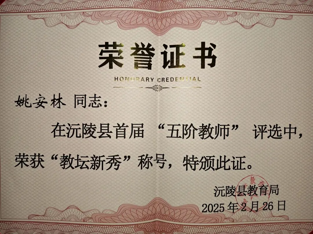 在沅陵县首届“五阶教师”评选中,我荣获教坛新秀的称号。