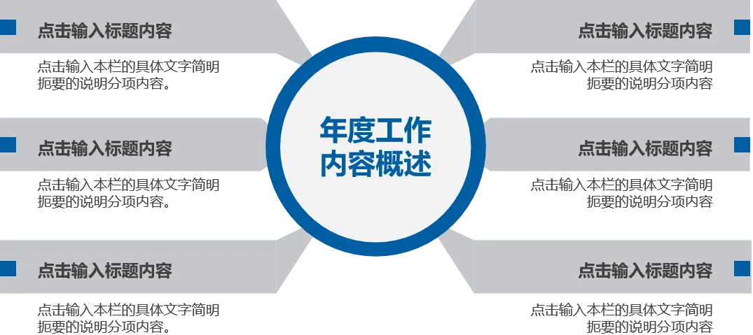 汇报主要分几个部分:年度工作概述、工作完成具体情况、成功项目详细展示、工作存在不足之处、来年工作目标计划。目录几个部分的字数尽量一致!