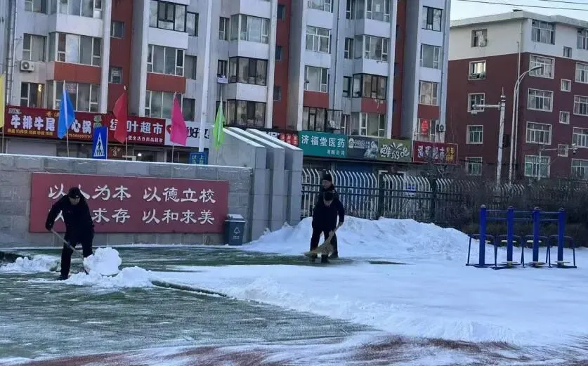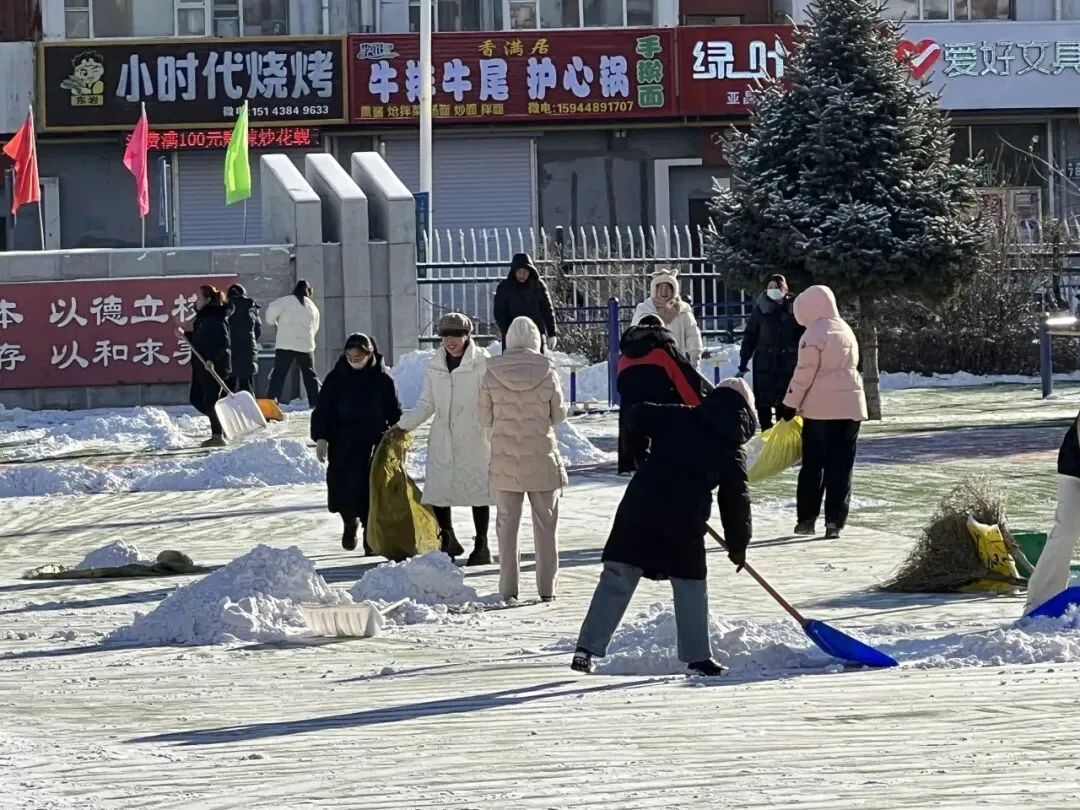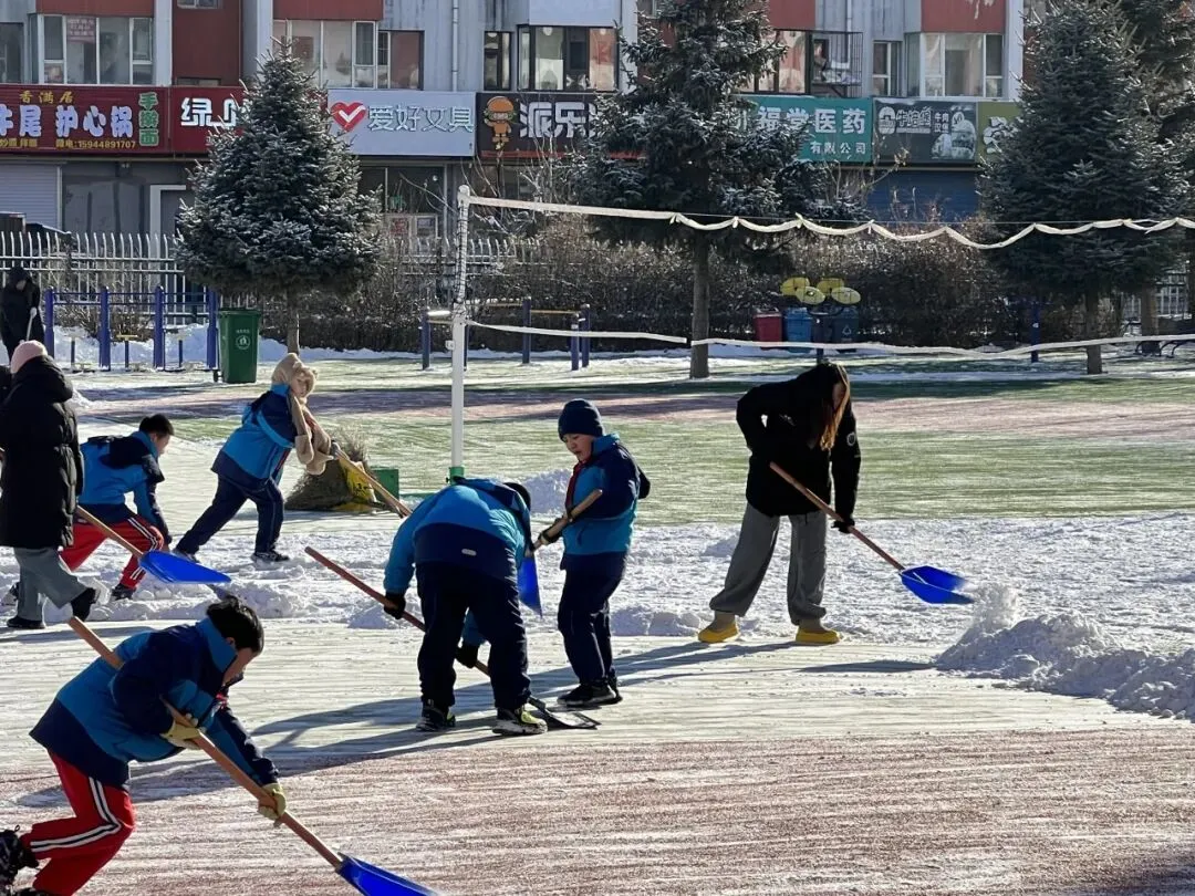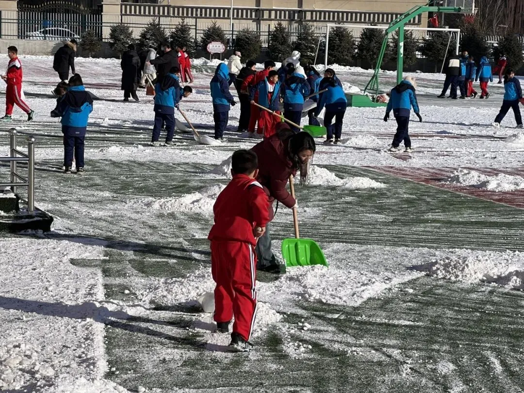 冰雪世界奇妙无比,孩子们在操场拔河、打雪球、堆雪人、打滚滚,快乐玩冰雪。但是,为了防止孩子们操场滑倒,所以,开心过后,组织孩子们一起清理积雪,家长朋友也纷纷加入其中,热闹的劳动场景让校园充满生机。