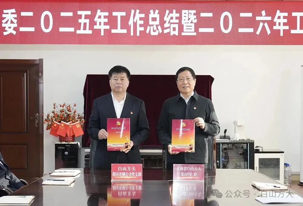 1月3日上午,白山方大集团党委召开2025年工作总结暨2026年工作安排大会,集团全体共产党员及入党积极分子参加了会议。会上,白山方大集团党委分别与白山方大糖酒站党支部、白山方大家电超市党支部和机关党支部签订了《2026年党建工作目标责任书》,将党建工作目标和主要任务以《责任书》的形式分解到各个党支部百分考核之中。集团党委书记、董事长宁凤莲作了题为《坚定信心、迎难而上、接续奋斗,为开创白山方大高质量发展新局面提供有力保障》的工作报告。《报告》总结回顾了一年来的主要工作:一、坚定政治方向,强化学习教育,深入贯彻落实党的二十届三中、四中全会精神;二、紧扣中心工作,优化组织功能,不断拓展党建工作的新空间;三、凝聚爱国热情,体现责任担当,持续锤炼党员队伍的先进性;四、发挥自身优势,增进情感交融,稳步提升群团组织的感召力。集团党委书记、董事长宁凤莲代表集团党委提出2026年重点抓好的四项主要工作任务: 一、认清形势,学思践悟,坚持不懈地学习贯彻落实党的二十大和二十届历次全会精神。 二、坚持标准,压实责任,全面系统地提升党支部“五化”建设的层次和水平。 三、凝心聚力,守正创新,深入持久地促进企业文化建设的丰富和发展。 四、履职尽责,关爱员工,扎实有效地发挥群团组织的优势和作用。