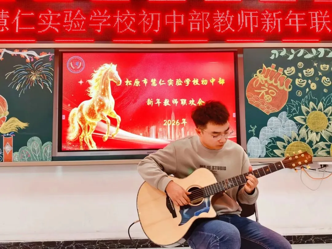 理化组姜岩老师怀抱吉他登台,一曲《风之诗》独奏悠然奏响。指尖轻拨琴弦,悠扬旋律缓缓流淌,空灵乐声如清风拂过心田,为联欢会增添了雅致淡然的诗意氛围。