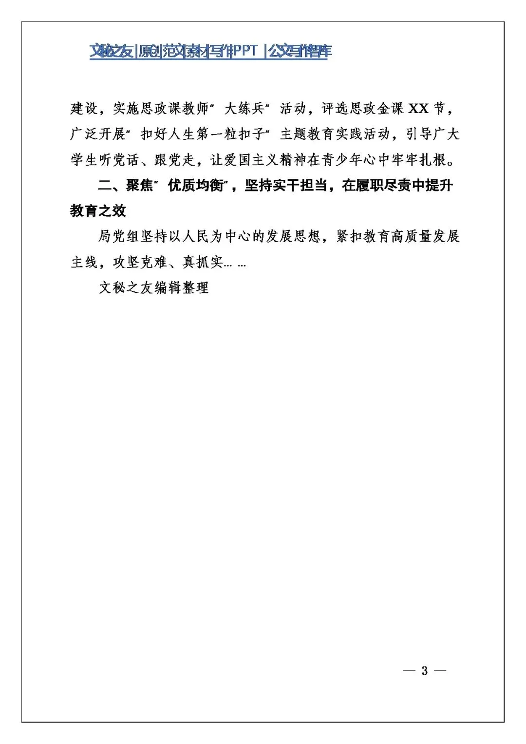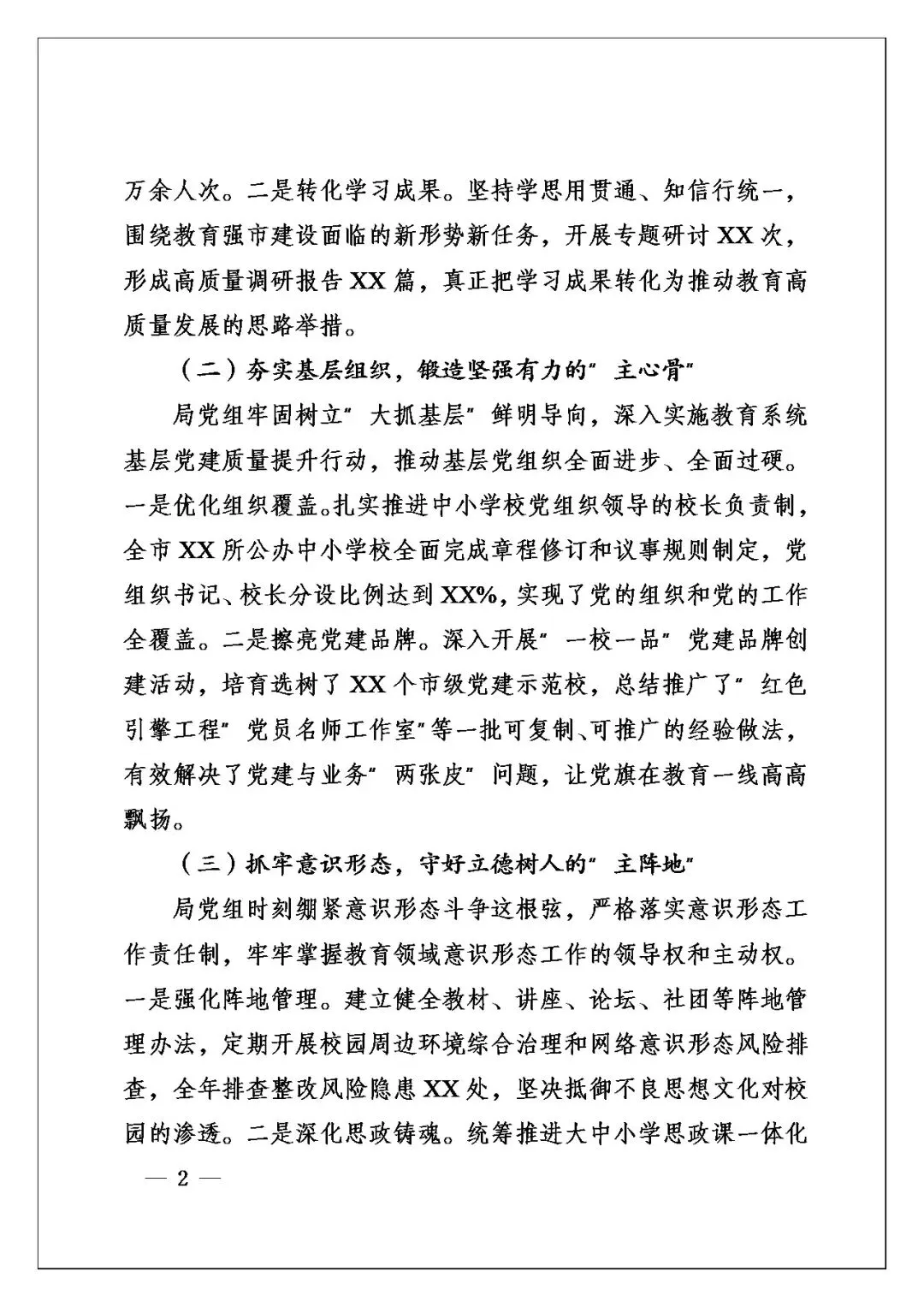结构我感觉像搭骨架立柱,开篇交代背景与指导思想,主体分“聚焦铸魂育人”“聚焦优质均衡”两大板块,每板块下细化“深化理论武装”“夯实基层组织”“抓牢意识形态”等子点,逻辑顺、承接紧,把全年履职全景有序铺开,读着脉络清、不跳脱,上级能顺着理路看清思路、举措与成效。