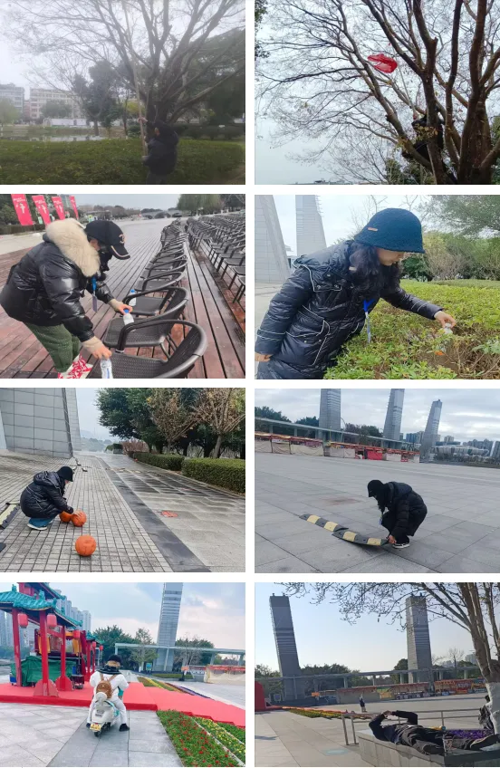 物业工作人员开展园区环境整治及秩序维护专项工作:清理水景公园树枝上缠绕的孔明灯,清除中心湖公园浮雕区域休闲座椅上的矿泉水瓶、西塔柱绿化带内的饮料瓶、地面遗留的篮球,以及下沉式压线槽减速带;同时对游客骑车入园、躺卧公共区域等违规行为进行文明劝导,全力保障园区环境整洁、秩序井然。