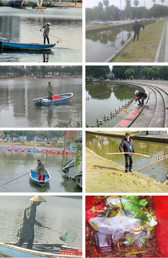 物业工作人员每日对湖面开展多频次保洁作业,及时打捞死鱼、枯枝、饮料瓶、塑料袋、餐饮残渣等各类废弃物,全力维护湖面水体的清洁状态。