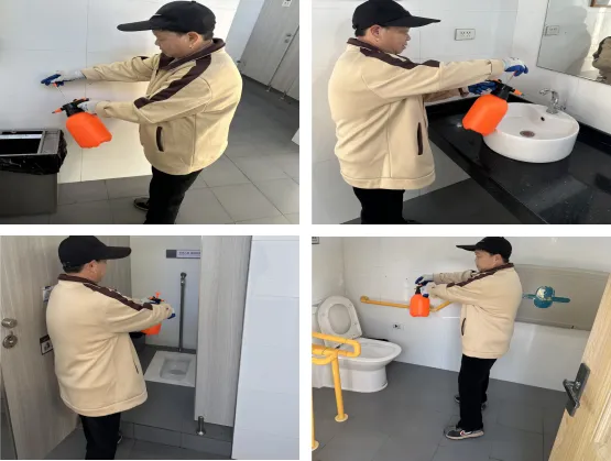 为保障园区公共卫生安全,给市民游客营造洁净的如厕环境,物业保洁人员对园区公共卫生间开展精细化消杀作业。工作人员使用专业工具,对垃圾桶、洗手台、便器、扶手等高频接触区域逐一喷洒消毒,确保消杀无死角、全覆盖。