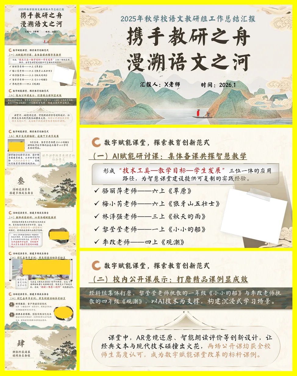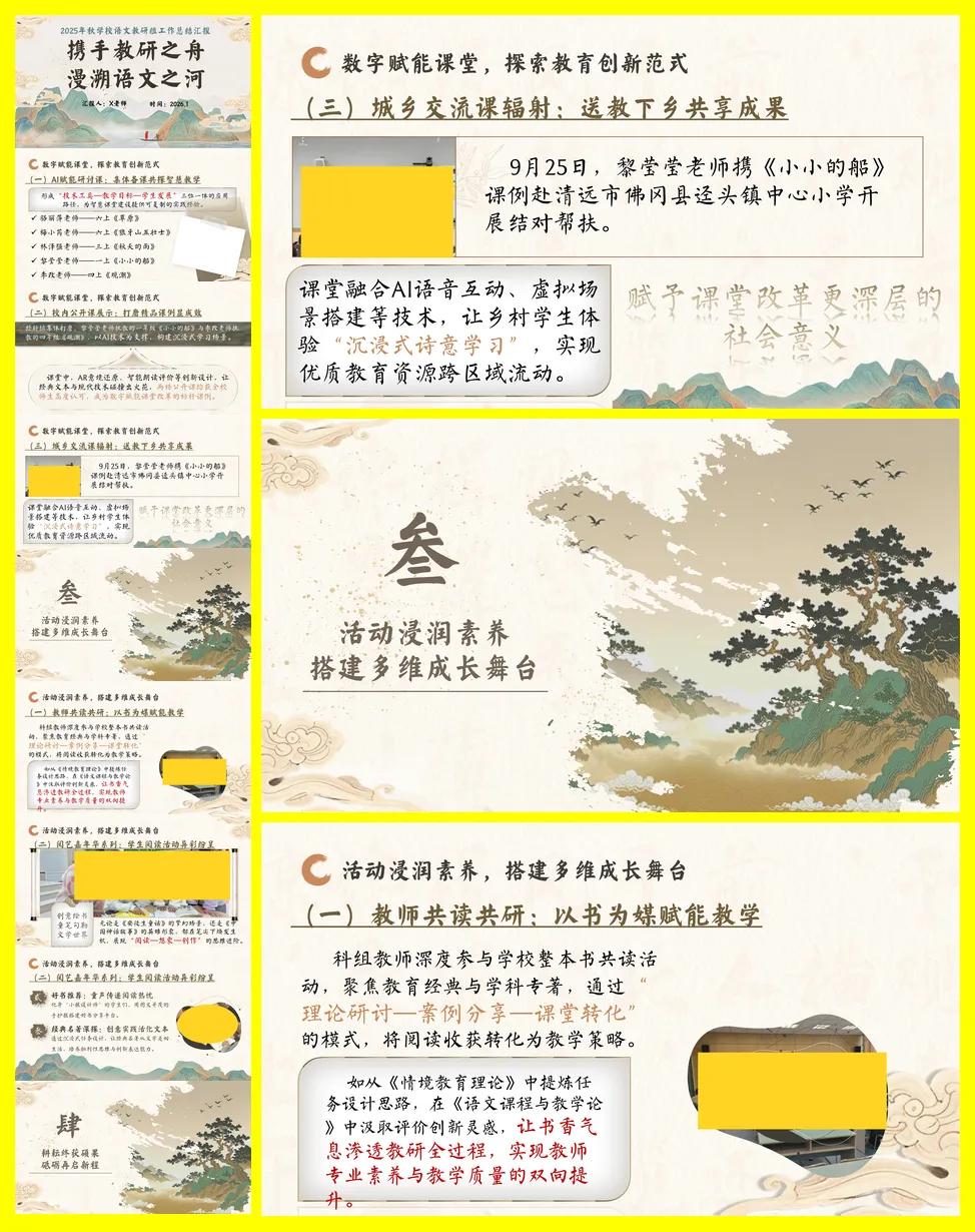 二、数字赋能,探索课堂创新。 以“AI赋能未来课堂”为核心,采用集体研讨与年轻教师实践相结合的模式,成功打造了5节AI融合研讨课。黎莹莹老师的《小小的船》和李改老师的《观潮》作为标杆课例,利用AR、智能朗读等技术构建沉浸式学习场景,并获得校内外高度认可。黎莹莹老师更将AI课例送至清远乡村学校,促进了城乡教育交流。