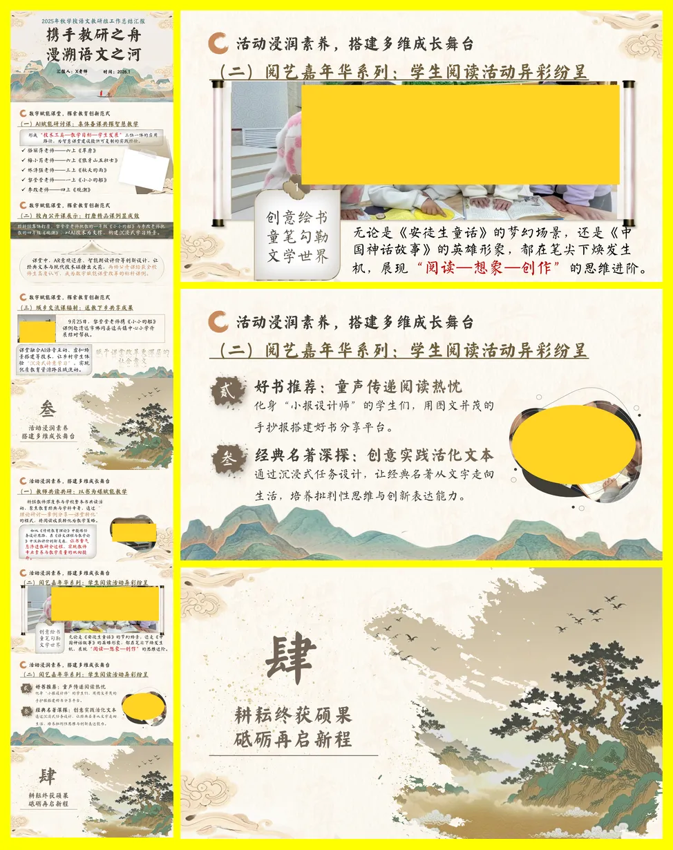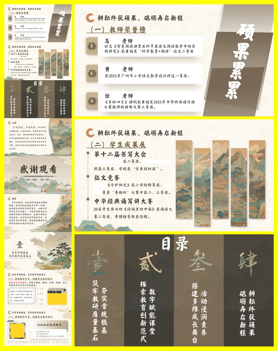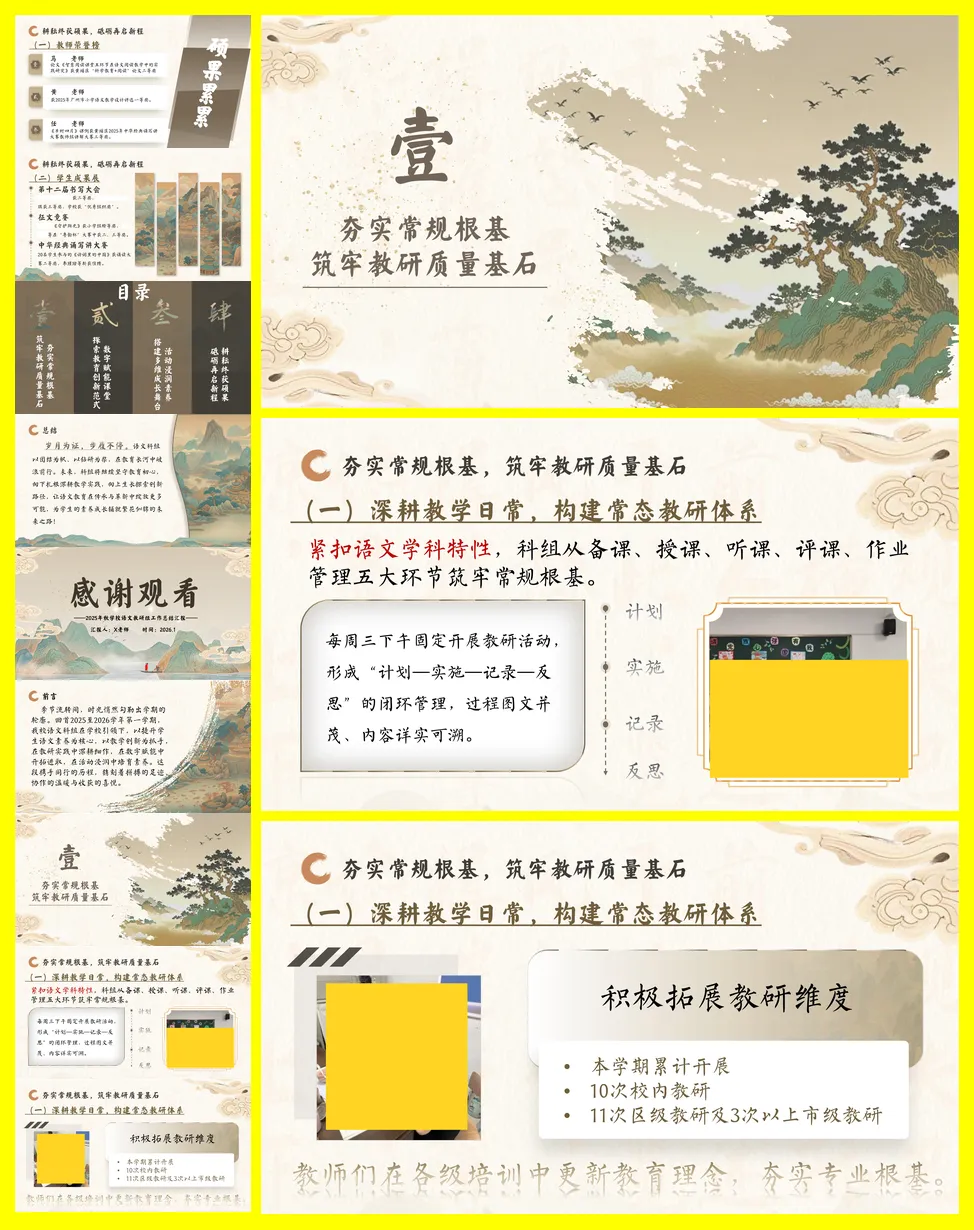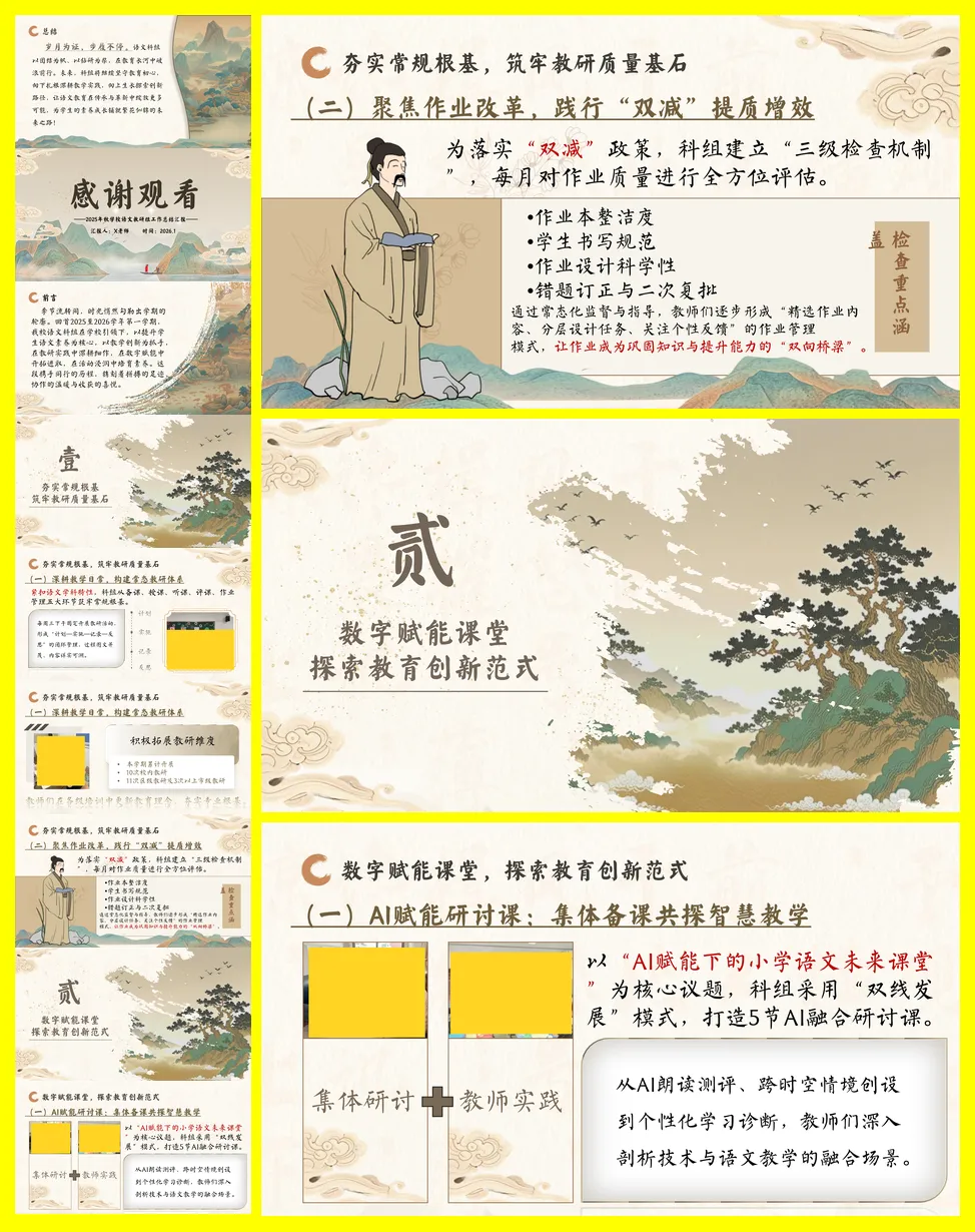 四、耕耘收获,展望未来。 学期内,多位教师在论文、课题、教学设计及课例评选中获奖,学生在书写、征文、经典诵读等竞赛中亦成绩斐然。教研组表示将继续深耕教学,探索创新,助力学生成长。