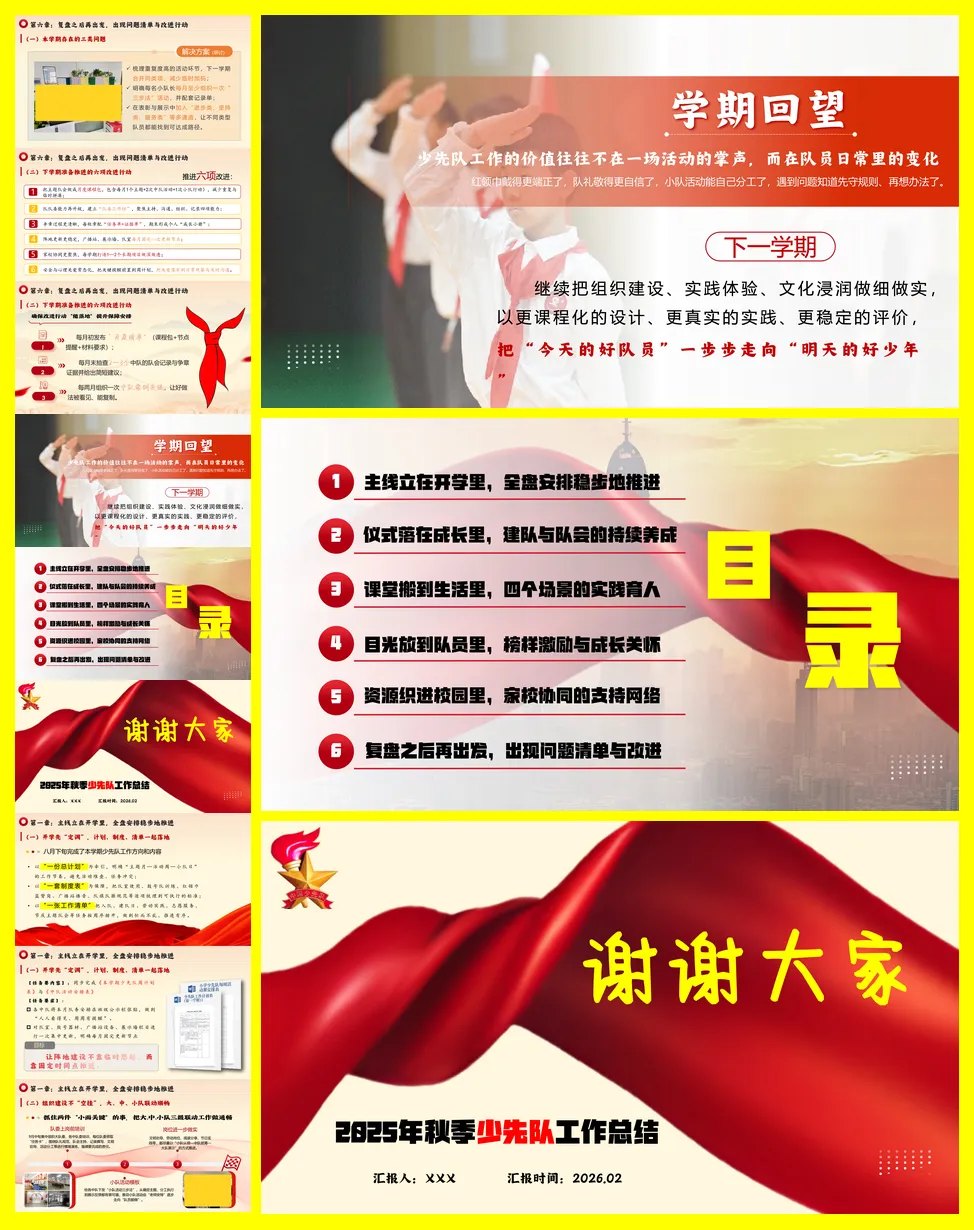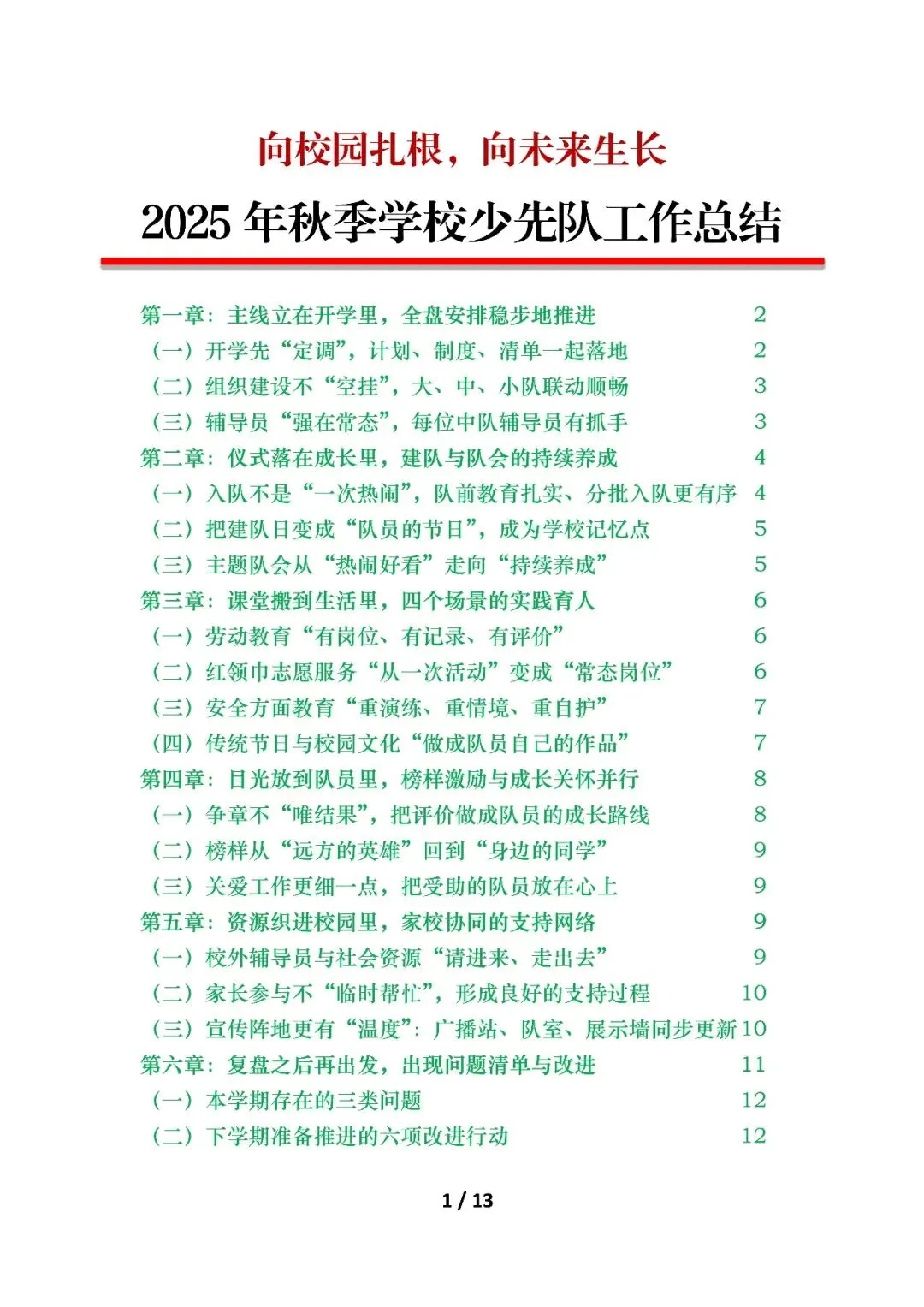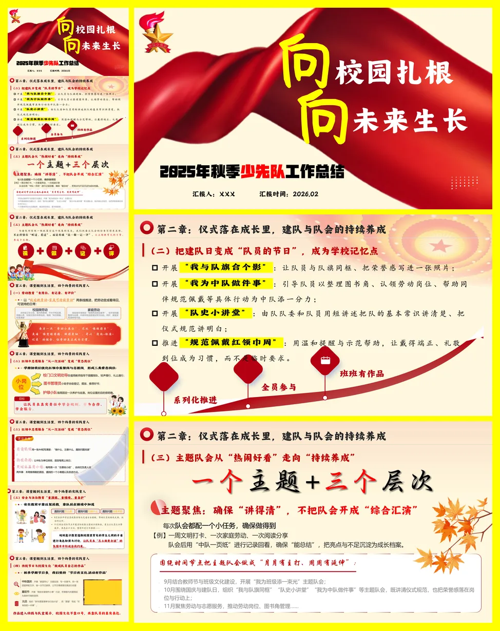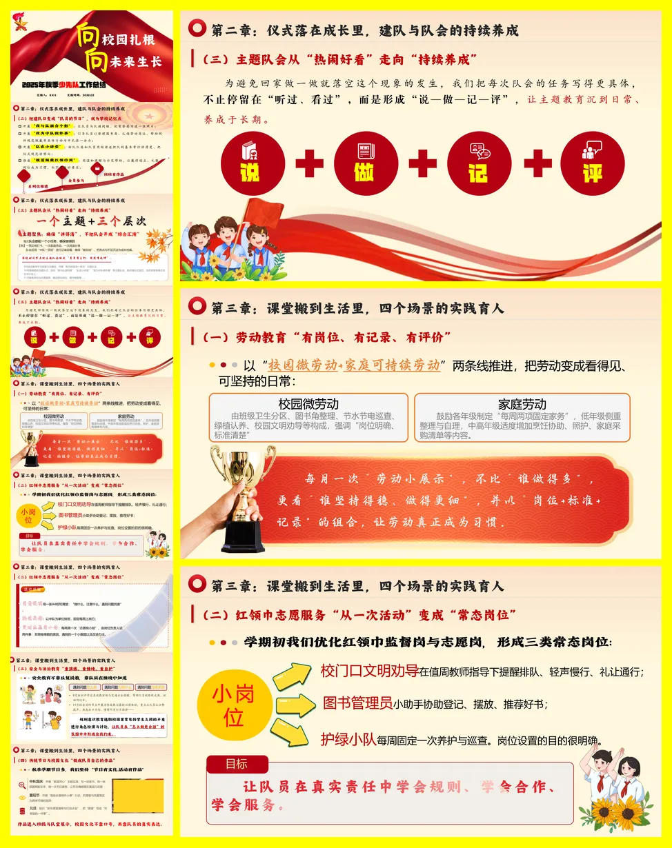 2025年秋季学期某学校的少先队工作总结报告,标题为“向校园扎根,向未来生长”。全文围绕如何将少先队工作系统化、日常化展开,旨在让队员的成长看得见、可持续。