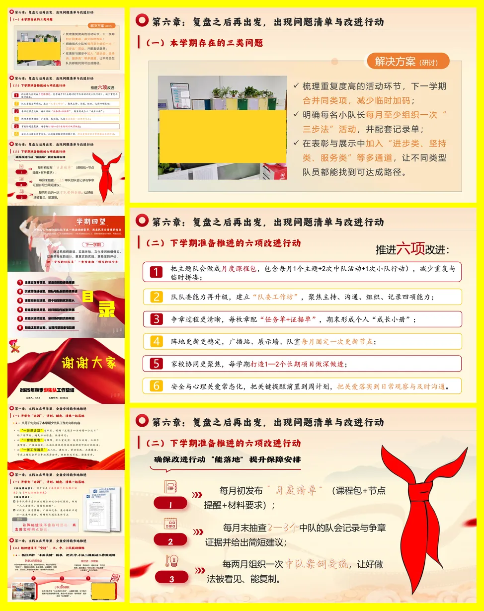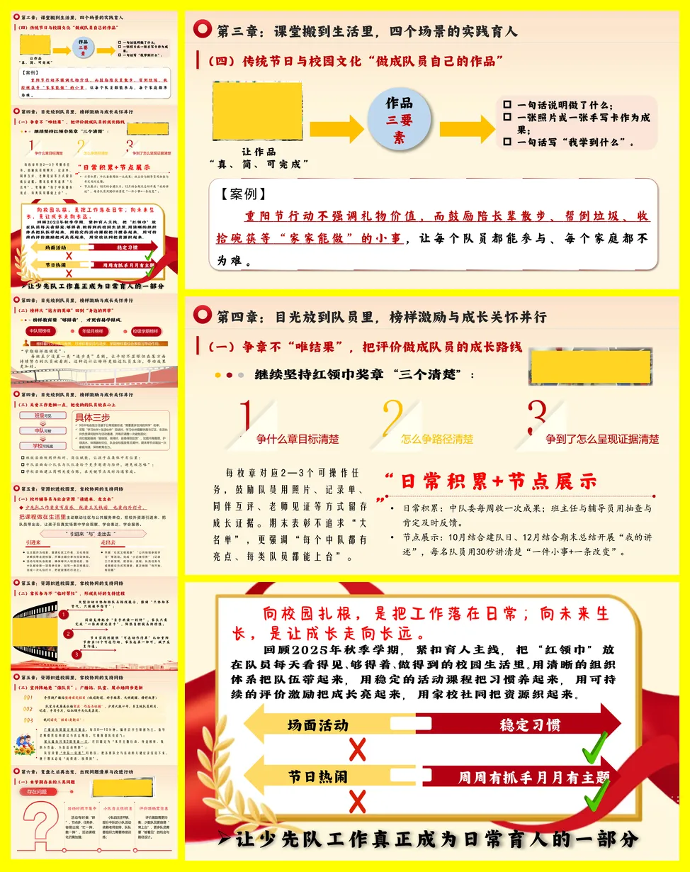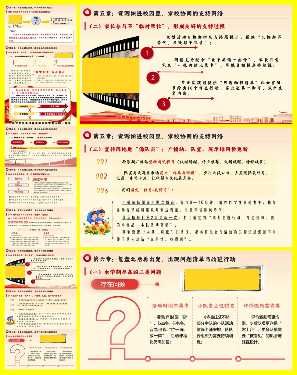 总结分为六章。第一章强调开学初的全盘规划,通过制定总计划、制度表和工作清单,确保学期活动有序推进,并加强大、中、小队的三级联动及辅导员队伍建设。第二章聚焦仪式教育,通过扎实的队前教育、系列化的建队日活动以及“主题-任务-记录”一体化的主题队会,将仪式感转化为持续的成长习惯。第三章实践育人,在劳动、志愿服务、安全教育和传统节日四大场景中,设计有岗位、有记录、可评价的常态活动,让教育融入生活。第四章关注队员个体,通过过程性的争章评价、身边的榜样激励和细致的关爱工作,促进每位队员的成长。第五章整合家校与社会资源,通过“请进来、走出去”的方式丰富体验,并让家长参与和宣传阵地更具温度。最后一章进行复盘,指出活动碎片化、小队自主性不足、评价均衡性待提升三类问题,并规划了下学期六项改进行动,如打造月度课程包、建立队委工作坊等,以期未来工作更扎实、更有效。