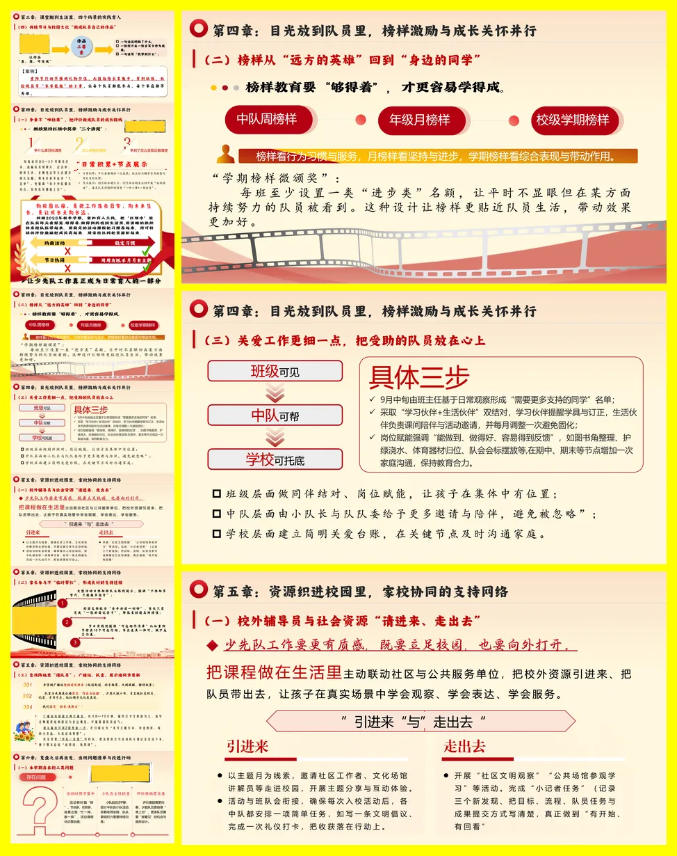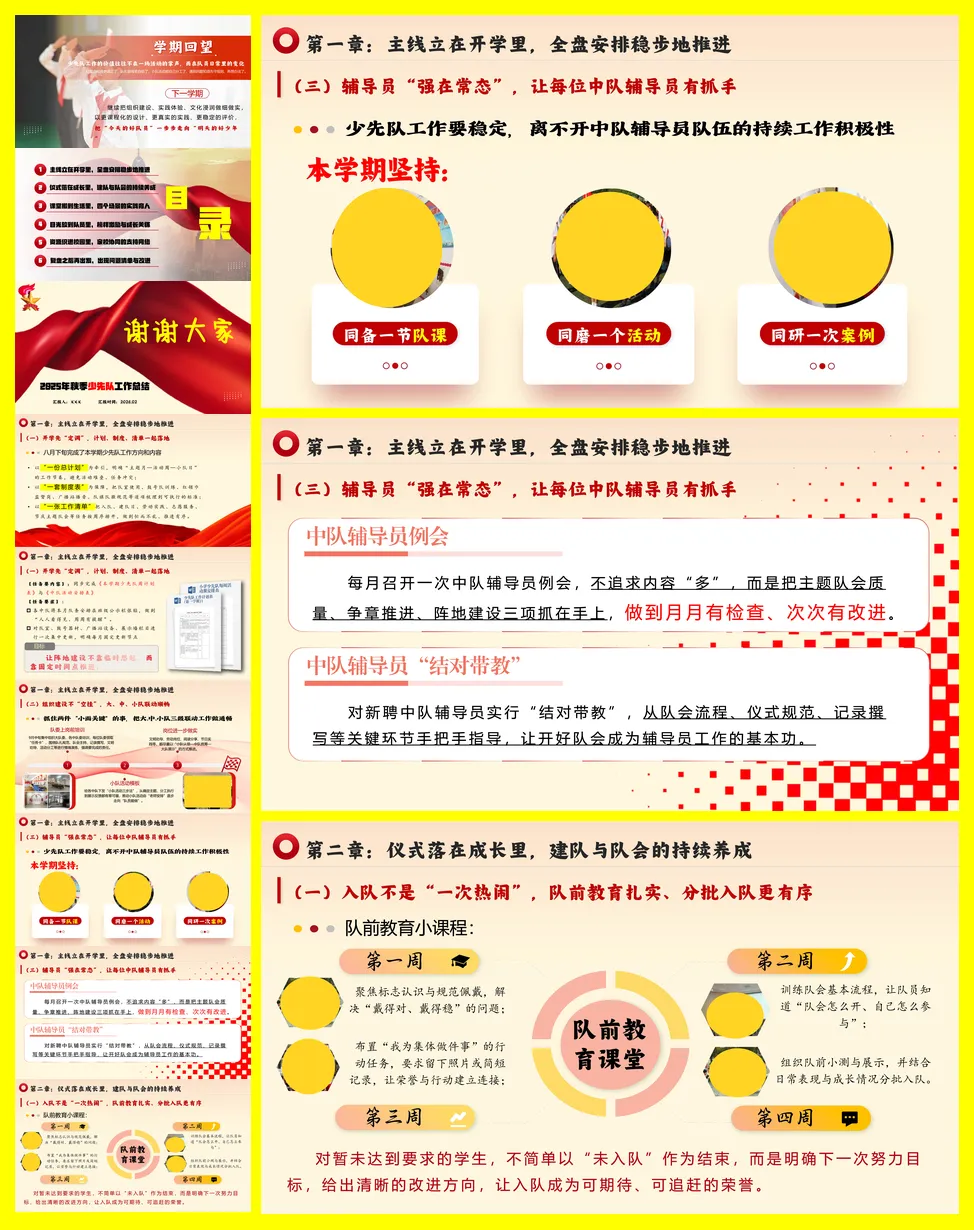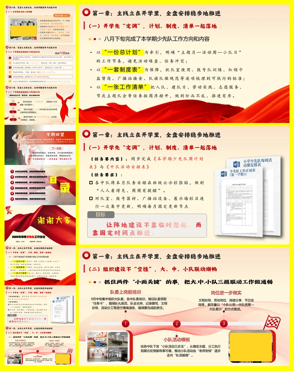 总结分为六章。第一章强调开学初的全盘规划,通过制定总计划、制度表和工作清单,确保学期活动有序推进,并加强大、中、小队的三级联动及辅导员队伍建设。第二章聚焦仪式教育,通过扎实的队前教育、系列化的建队日活动以及“主题-任务-记录”一体化的主题队会,将仪式感转化为持续的成长习惯。第三章实践育人,在劳动、志愿服务、安全教育和传统节日四大场景中,设计有岗位、有记录、可评价的常态活动,让教育融入生活。第四章关注队员个体,通过过程性的争章评价、身边的榜样激励和细致的关爱工作,促进每位队员的成长。第五章整合家校与社会资源,通过“请进来、走出去”的方式丰富体验,并让家长参与和宣传阵地更具温度。最后一章进行复盘,指出活动碎片化、小队自主性不足、评价均衡性待提升三类问题,并规划了下学期六项改进行动,如打造月度课程包、建立队委工作坊等,以期未来工作更扎实、更有效。