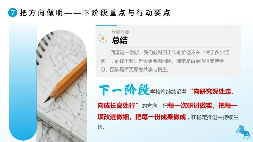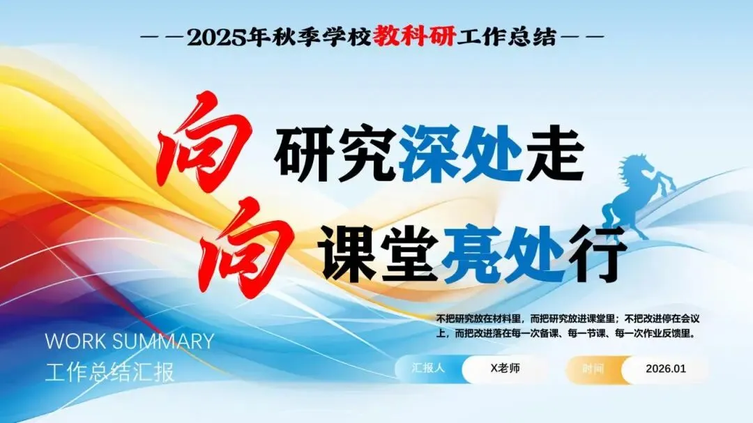 今日给大家分享2026年春新版《学校教科研工作总结:向研究深处走,向课堂亮处行》PPT课件,附电子版网盘链接,可免费下载编辑。