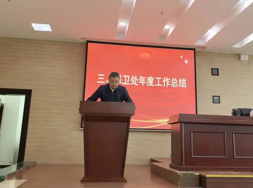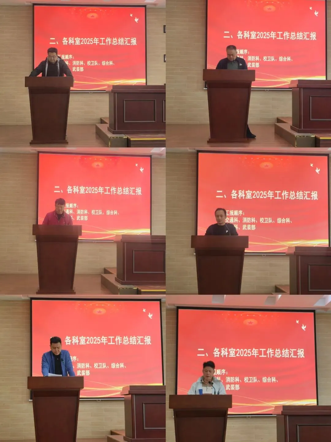 会议伊始,各科室负责人依次进行2025年度工作汇报,全面梳理了交通管理、消防安全、校园巡逻、治安防控及武装工作等核心任务,亮实绩、找短板、明方向。随后,党支部书记于继皓作校园安全稳定专项工作总结,系统回顾了全年工作成效,客观分析工作中存在的薄弱环节,并明确下一年度保卫工作的重点方向与具体推进举措。