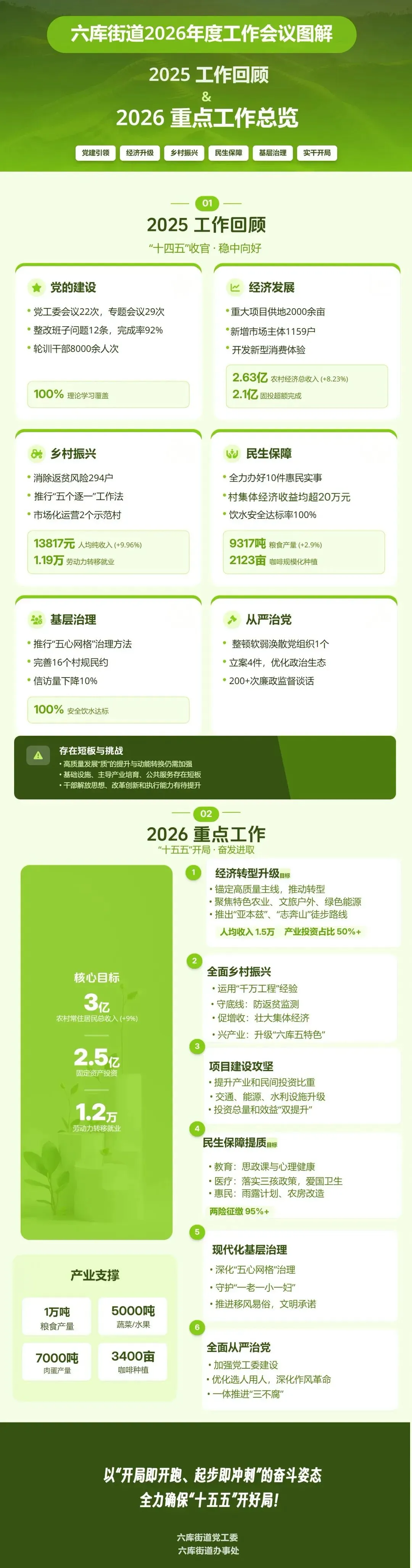 “上项目、拼经济、抓发展”。农村经济总收入2.63亿元(增 8.23%),固定资产投资2.1亿元超额完成年初下达的2亿元的固定资产投资任务。重大项目供地2000余亩;新增市场主体1159户,培育农民专业合作社139户,经营收入共计1225万元、较2024年增长19.73%。谋划申报22个入库项目,开发新型消费体验,招引企业入驻,谋划推出“亚本兹””志奔山”两条精品户外徒步路线。