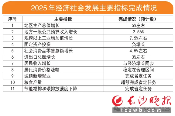 一是多措并举稳住经济大盘。系统性抓好部署推进。全力抢抓“两重”“两新”、专项债项目自审自发试点等政策机遇,出台实施提振消费、招商引资、促进投资、扶持企业等系列政策措施,强化形势研判、四级调度、专班推进,持续补短挖潜、扩需育新,推动经济运行总体平稳、向新向好。全年争取超长期特别国债资金和中央预算内投资102.06亿元、增长52.6%,发行项目类专项债券265.96亿元,直接带动投资超千亿元。协同性促进有效投资。坚持“国资、民资、外资”齐抓,推动“工作量、实物量、投资量”齐上,省市重点项目、“五个十大”项目均超额完成年度投资计划。海信(长沙)产业园、玉湖冷链(长沙)交易中心、蓝思智能制造产业基地、高新创投超精密高端制造产业基地等一批重大产业项目投产达效。新引进2亿元以上重大项目230个,签约落地圣钘科技、中联数智园、宏工科技、惠科直显、纳维制造等6个百亿级项目。新注册湘商回归企业220家,校友回湘到位资金332亿元。创新性推动消费扩容。大力实施提振消费十大行动,开展国家消费新业态新模式新场景试点,放大“湘超”赛事、会展活动带动效应,培育壮大演艺经济,以首发、首店经济激活消费,首店密度稳居全国前10位,举办促消费活动400余场,带动全社会消费超420亿元,社会消费品零售总额增长4.5%左右。举办“快乐长沙·与宁乡约”第四届旅游发展大会、浏阳创意焰火燃放活动48场,口岸入境国外游客数量居中部城市首位,入选“2025全球100目的地”、全国假日旅游热门城市前10。针对性稳住外资外贸。深入开展生产型企业进出口提升行动,支持长沙优质产能和产品“走出去”,实际使用外资、对外实际投资分别增长14.4%、30%,进出口总额增长3%左右,总量占全省比重达53%、创历史新高。其中对共建“一带一路”国家、RCEP成员国、非洲国家贸易分别增长11%、10.3%、45.3%,“新三样”产品出口增长86.7%。