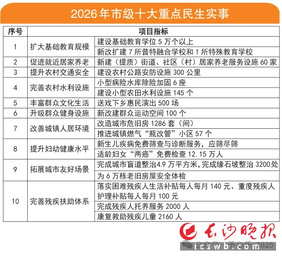 (十)着力保障改善民生,努力为人民群众多办实事。加强普惠性、基础性、兜底性民生建设,用心用情解决人民群众急难愁盼问题,不断增进民生福祉。办好十大重点民生实事。建设基础教育学位5万个以上,新改扩建7所普特融合学校和1所特殊教育学校。新建(提质)街道、社区(村)居家养老服务设施60家。建设农村公路安防设施300公里。小型病险水库除险加固6座,建设小型农田水利设施145个。送戏下乡惠民演出500场。新改建群众运动空间100个。改造城市危旧房1286套(间),推进城镇燃气“瓶改管”小区57个。新生儿疾病免费筛查与诊断服务,应筛尽筛;适龄妇女“两癌”免费检查12.15万人。完成城市盲道整治4.9万平方米,完成缘石坡整治3200处;为6万栋老旧房屋安全体检。落实困难残疾人生活补贴每人每月140元、重度残疾人护理补贴每人每月100元,完成残疾人托养服务2000人,康复救助残疾儿童2160人。促进高质量充分就业。实施稳岗扩容提质、职业技能提升行动,稳定高校毕业生、农民工等重点群体就业,加强新就业群体友好场景建设,确保零就业家庭动态清零。办好人民满意教育。有序推进基础教育学位滚动建设,新改扩建长郡中学新校区等7所公办高中,探索中高等职业学校集团化办学,推进市属高校资源整合、高职院校转型发展。完善专门教育收生入学办法,提升教育矫治水平。落实立德树人根本任务,加强师德师风建设,促进学生身心健康发展。深化健康长沙建设。深入推进公立医院改革,优化医疗卫生机构分级诊疗布局,加力紧密型城市医疗集团和县域医共体建设。深入实施人均预期寿命提升行动和“减盐减油”专项行动,完善疾病预防控制体系。加强妇幼健康服务,发展普惠托育服务,降低生育养育成本。推动养老服务标准化建设,大力发展中医医养,开展免陪照护服务试点,健全安宁疗护服务体系。发展繁荣体育事业。全面启动第十六届全运会筹备工作,加快比赛场馆建设,积极备战第十五届省运会。持续加大全民健身场地设施建设,充分利用桥下空间打造“小而美”的体育场地,加快市体育产业园建设。加强体育后备人才培养,提升青少年竞技水平。高标准举办长沙网球公开赛等赛事,争取更多国际国内大型赛事落户长沙。提高社会保障水平。推动医保支付方式改革和基本医保参保精准扩面。落实新就业形态人员职业伤害保障试点,探索灵活就业人员失业保险新模式。优化保障性住房供给,扎实做好农房拆迁安置工作,积极推动住房公积金制度向非公企业、灵活就业人员覆盖。开展服务类社会救助试点,持续建设残疾人友好型城市,统筹做好红十字、慈善、志愿服务等工作。提升社会治理质效。坚持和发展新时代“枫桥经验”,深入践行“四下基层”制度,推动“三所一庭”与综治中心深度融合,抓好初信初访办理和重复信访治理。深入推进民意渠道融合联动一体化试点,拓展人民建议线上线下征集网络。加大预防和打击电信网络诈骗、黄赌毒等突出违法犯罪力度,推动常态化扫黑除恶斗争向纵深发展。实施公民道德建设工程,建设更高水平全国文明城市,用实干实事托举起长沙人民“稳稳的幸福”。