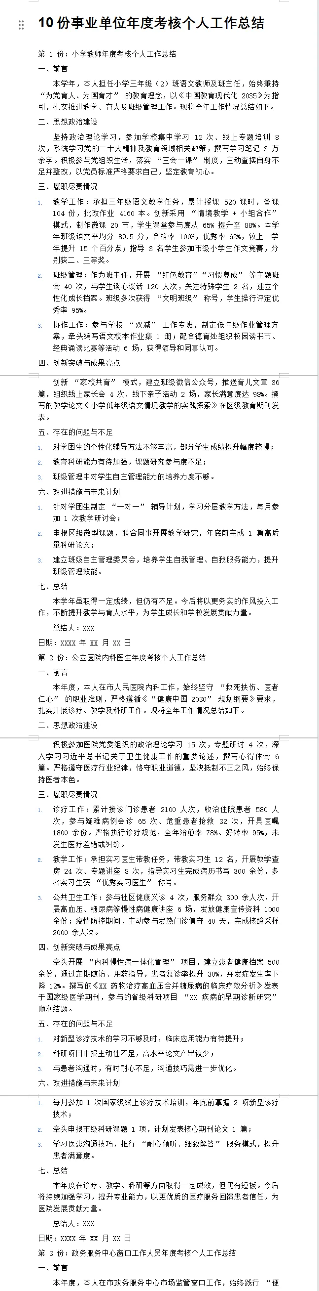 分享了10 个不同细分岗位(覆盖教育、医疗、政务、科研等核心领域)的年度个人总结模板,内容具体、贴合实际工作的年度工作总结,每份均突出岗位特色和量化成果,大家可直接修改信息使用。