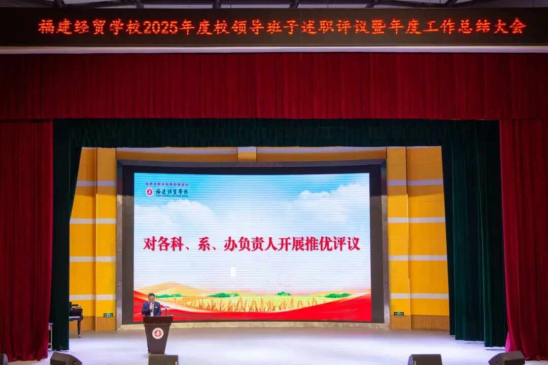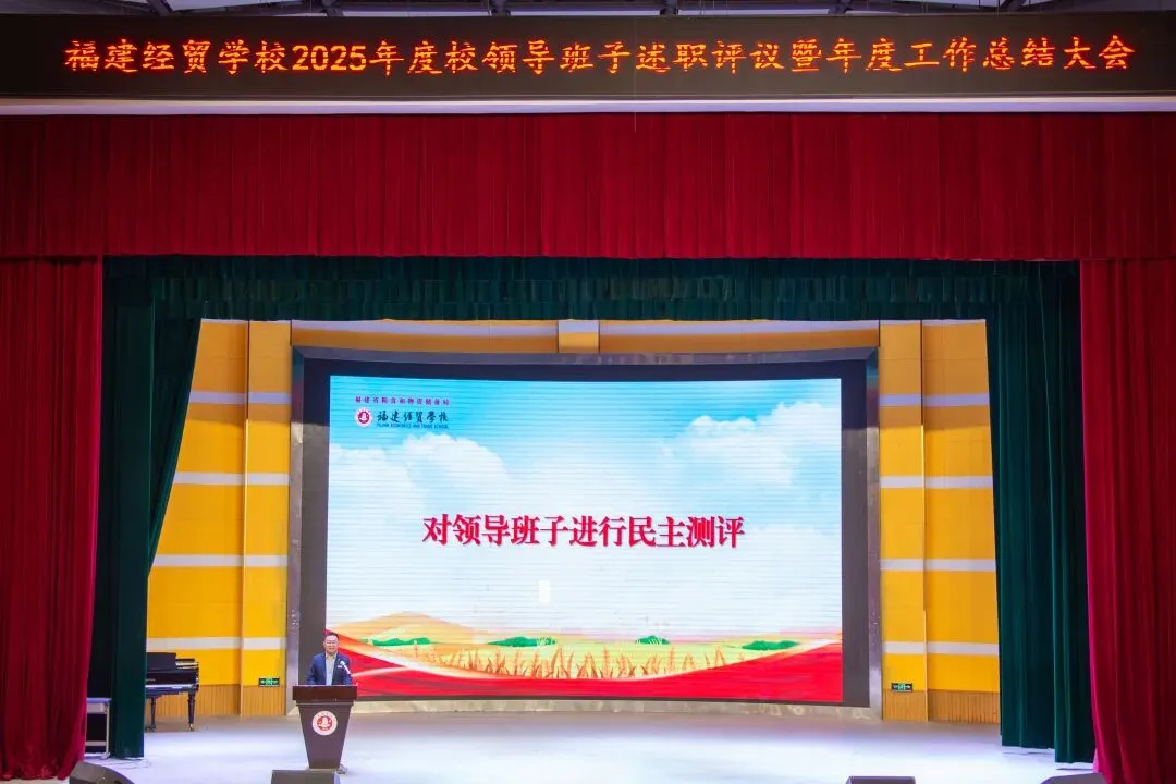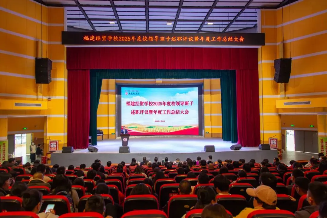 1月13日下午,福建经贸学校2025年度工作总结大会在礼堂召开,全面总结全年工作成效,明确2026年发展方向。省粮食和物资储备局机关党委(人事处)负责人一行莅会指导,校领导班子及全校教职工参会。会议由办公室主任关锦煌主持。