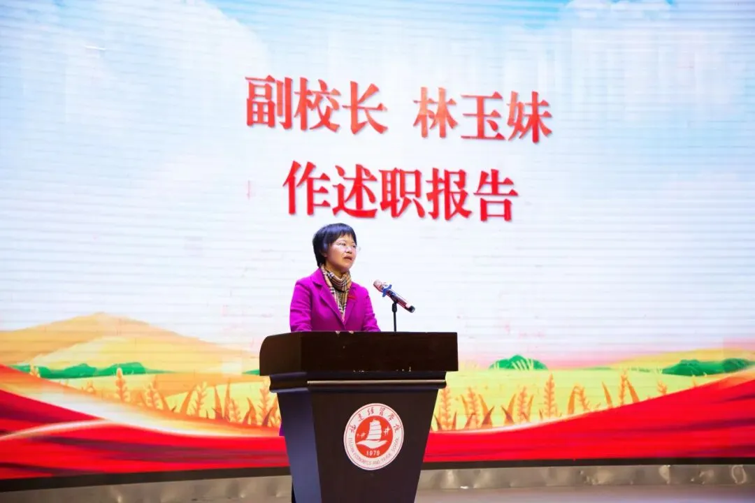 校领导班子述职评议环节,许逸斌书记、郑建芳校长,张永阳、林玉妹、杜闽军、熊永龙副校长作述职报告,系统总结成效、剖析不足。
