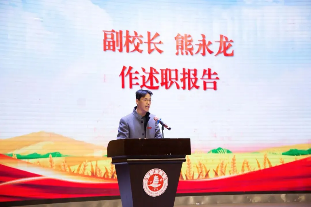 许逸斌书记作述职报告并讲话,围绕“讲政治、讲担当、讲奉献、讲规矩”四大核心展开。他表示,2025年学校始终以党建为引领,组织党委理论学习中心组学习、专题研讨,构建“大思政”育人格局,打造党建育人“全链条”,开展思政实践活动与“行走的思政课”,践行三全育人理念;聚力破解新校区三期产权证办理等历史遗留问题,推进粮检实训中心提升工程等重点项目,拓展中高职贯通培养模式;践行“四下基层”,接待师生访谈解决实际诉求,助力乡村振兴,激发队伍活力;严守廉洁底线,梳理廉政风险点,完善内控制度,营造风清气正校园生态。他强调,2026年将坚持守正创新,深化教师队伍建设与教育教学改革,拓展多元办学模式,持续破解历史遗留问题,以高质量党建引领学校事业高质量发展,为职业教育强国建设贡献力量。