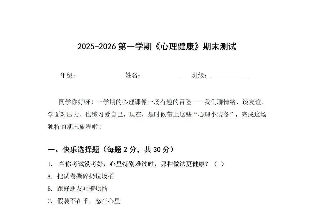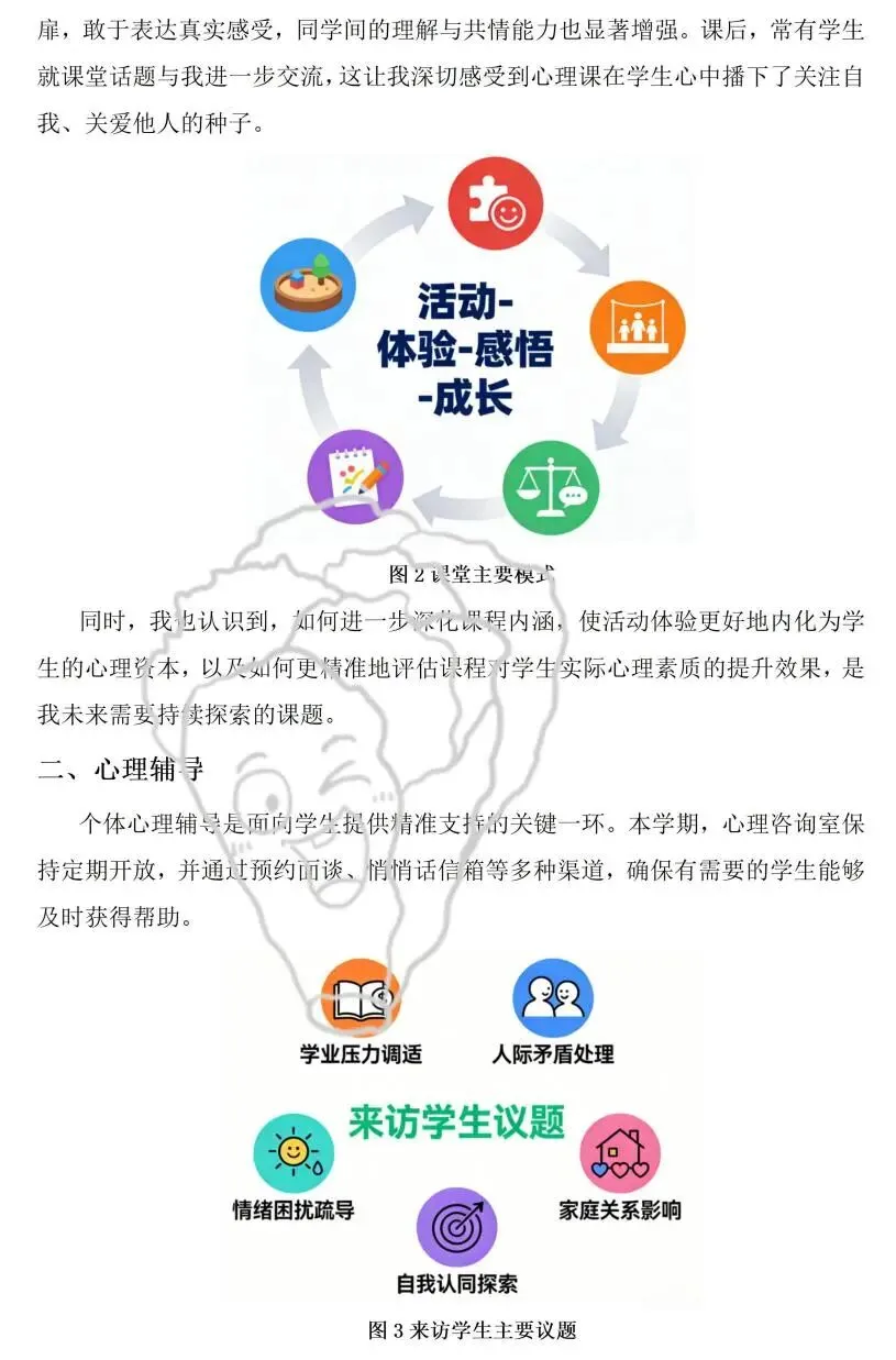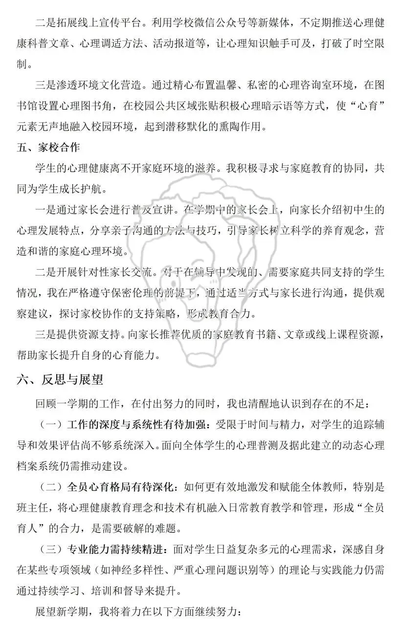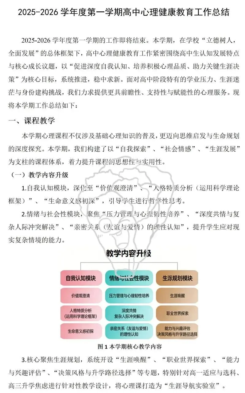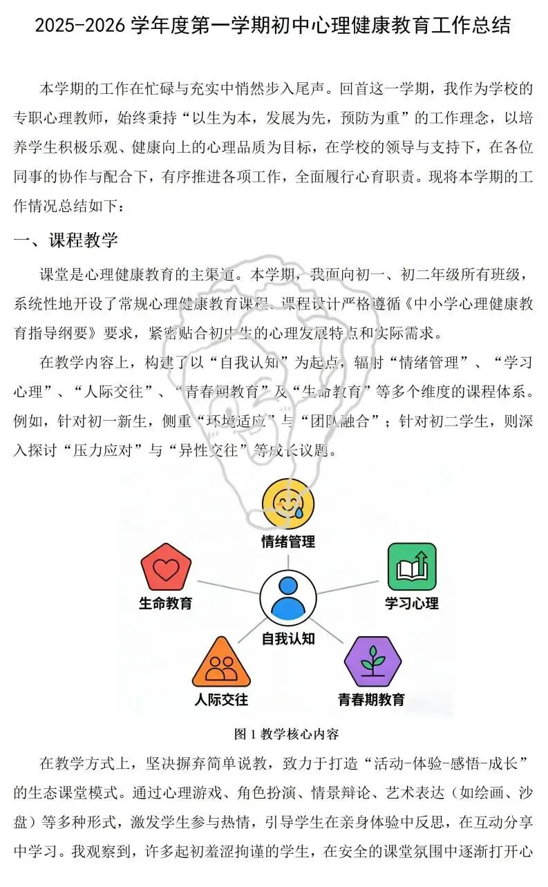 期末的钟声悄然敲响,又一学期的心理健康教育工作也即将画上了句点。作为和学生心灵打交道的教育者,每一份总结既是对过往工作的复盘梳理,也是对未来育人路径的校准沉淀。考虑到初高中学生心理发展特点差异显著,工作重点与实操方法也有所不同,我们整理了初中版 + 高中版两份期末心理工作总结,内容覆盖课程教学、个体辅导、团体活动、家校协同等核心模块,各位同行可以直接参考,也能根据本校学情灵活删减调整。希望这份小整理,能为大家的期末总结撰写省些力~