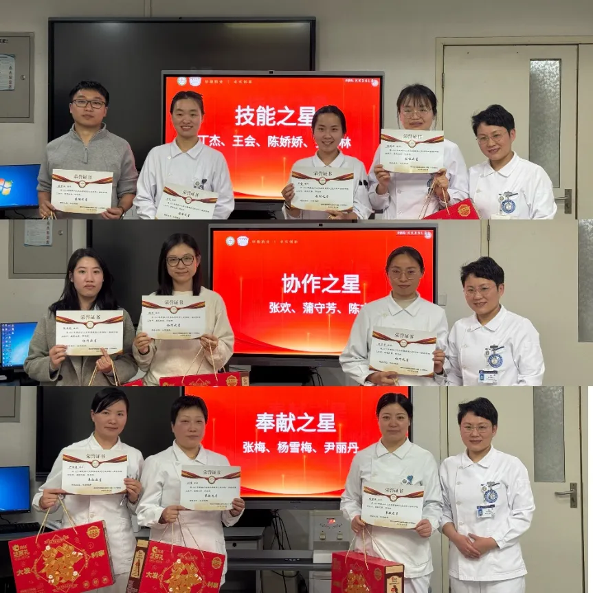 包芸护士长对病房2025年度整体护理工作进行总结。她用具体数据呈现全年工作量,依托多维评价指标体系系统总结工作成效,并围绕临床护理质量、教学能力提升、科研水平发展三大核心维度,对全体护理人员提出殷切期许,明确了2026年工作的重点和方向。会议设置表彰环节。为树立先进标杆、凝聚奋进力量,科室经前期民主评选,推选出“技能之星”“协作之星”“奉献之星”,并现场举行颁奖仪式。