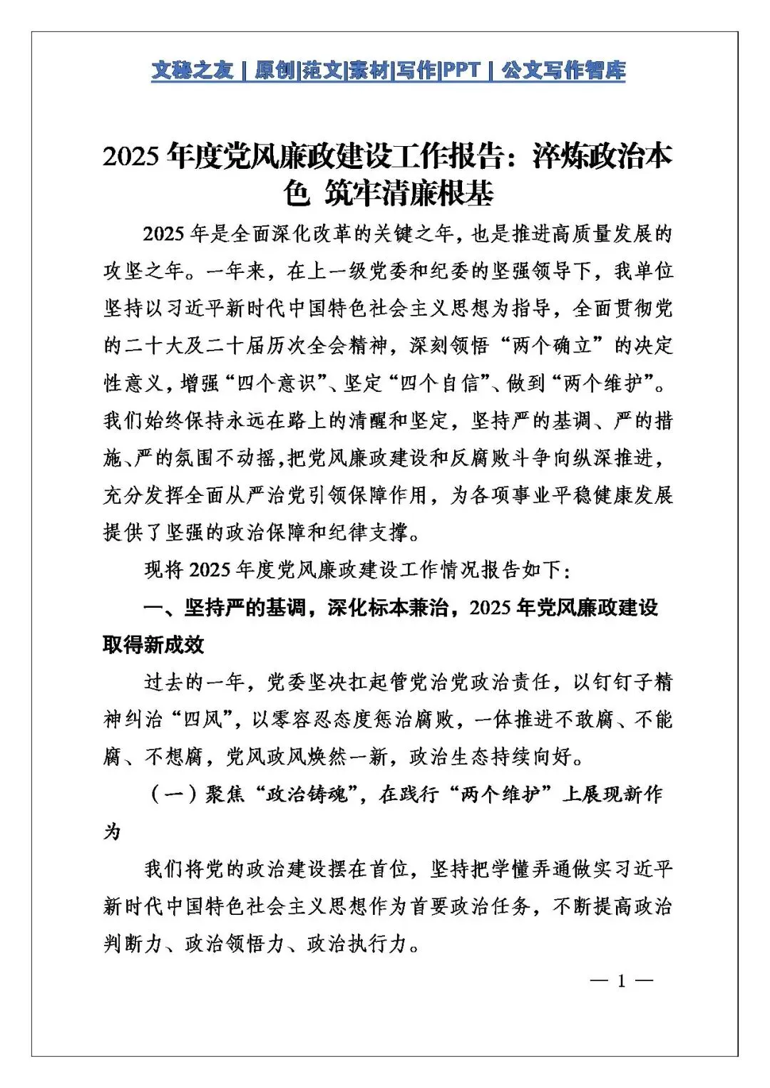 这份《2025年度党风廉政建设工作报告:淬炼政治本色 筑牢清廉根基》“不一般”,紧扣全面深化改革与高质量发展关键节点,架构严整、举措硬核,在我个人看来可以说是基层党风廉政建设总结的示范文本,值得笔杆子精研深读!